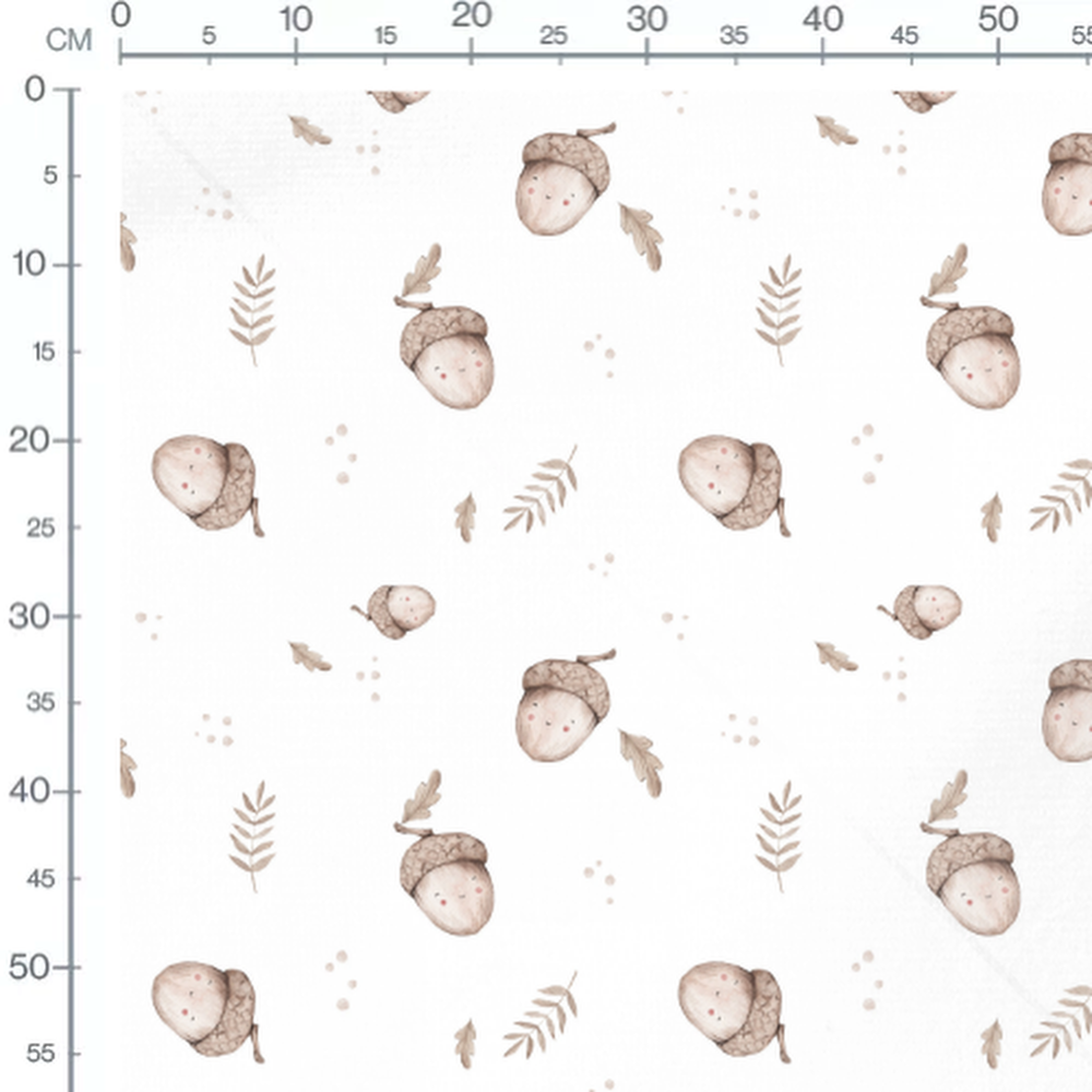 Les glands ont de petits visages souriants. Les feuilles sont stylisées et de couleur beige.Les tissus