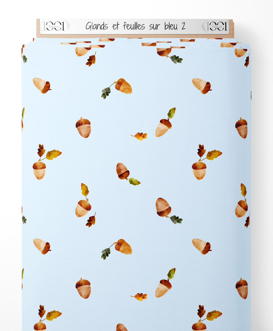 Les glands sont accompagnés de feuilles aux teintes automnales variées. Le fond bleu clair met en valeur les couleurs chaudes des motifs. Les feuilles présentent des nuances de vert, jaune et brun.Les tissus