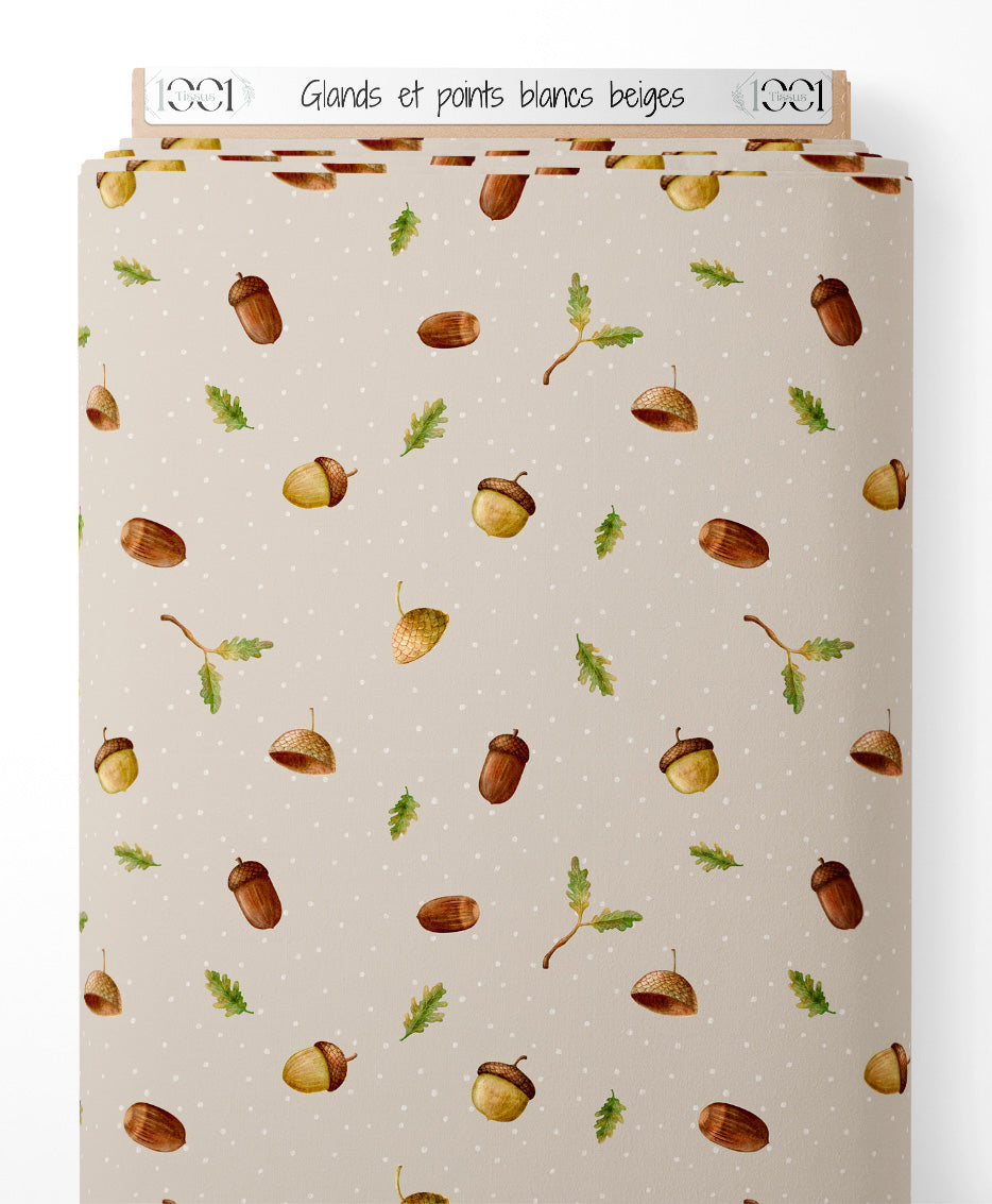 Les glands sont de différentes nuances de brun et vert. Les feuilles sont vertes avec des détails fins. Le fond beige est parsemé de petits points blancs.Les tissus