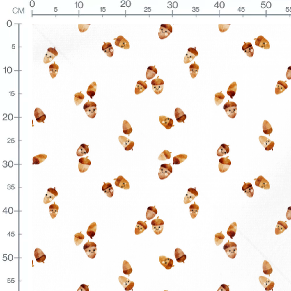 Les glands sont de différentes teintes de marron avec des expressions souriantes. Chaque gland est unique avec des variations subtiles dans les expressions faciales.Les tissus