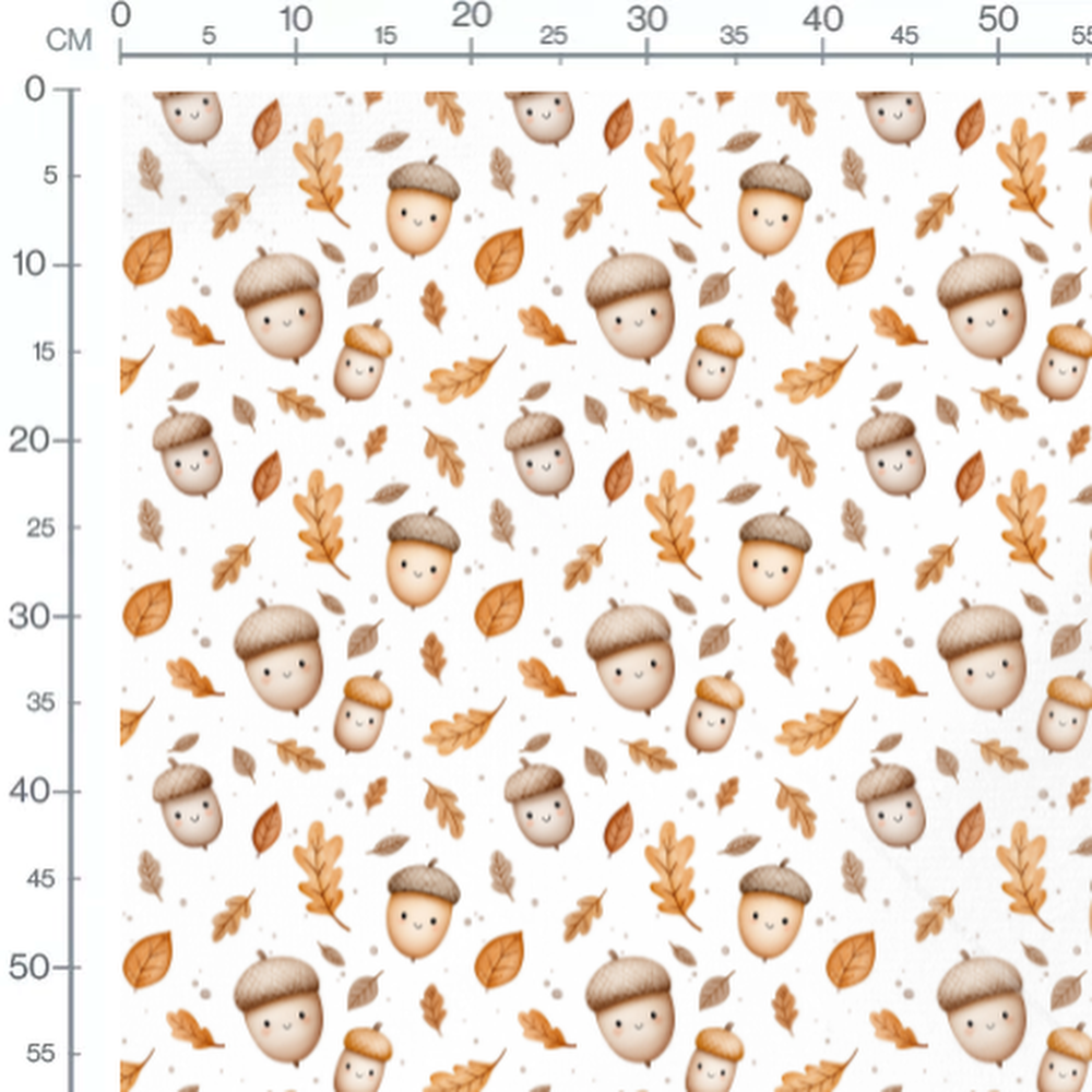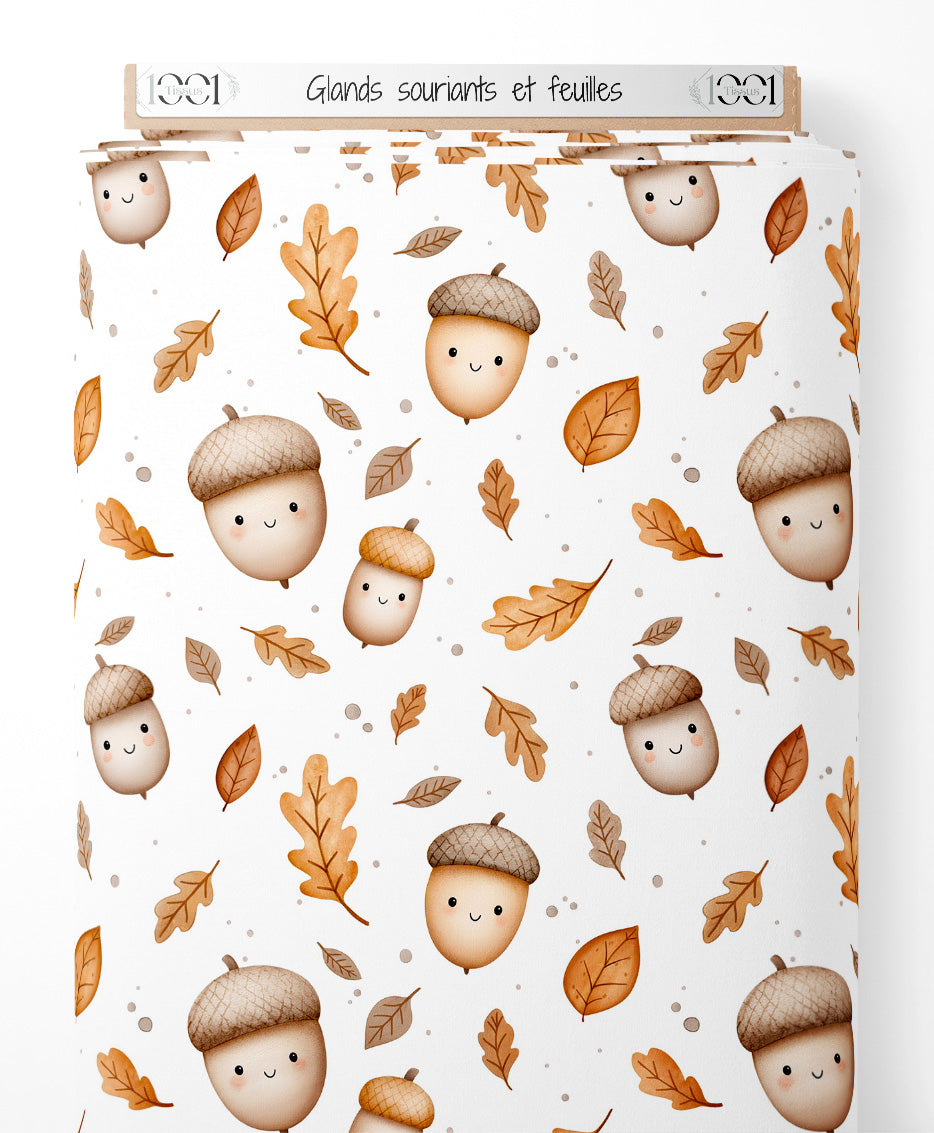 Les glands ont des visages souriants et sont entourés de petites feuilles. Les feuilles varient en forme et en teinte, allant du marron clair à l'orange vif.Les tissus