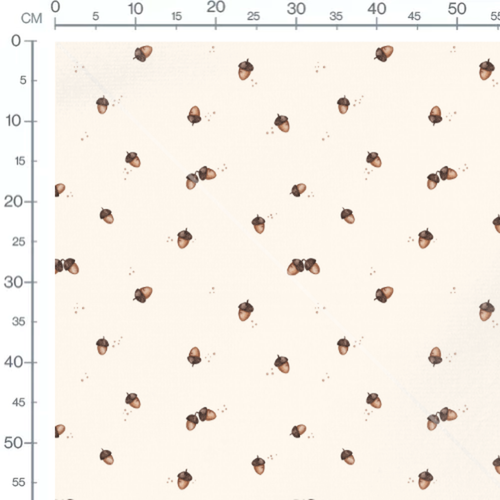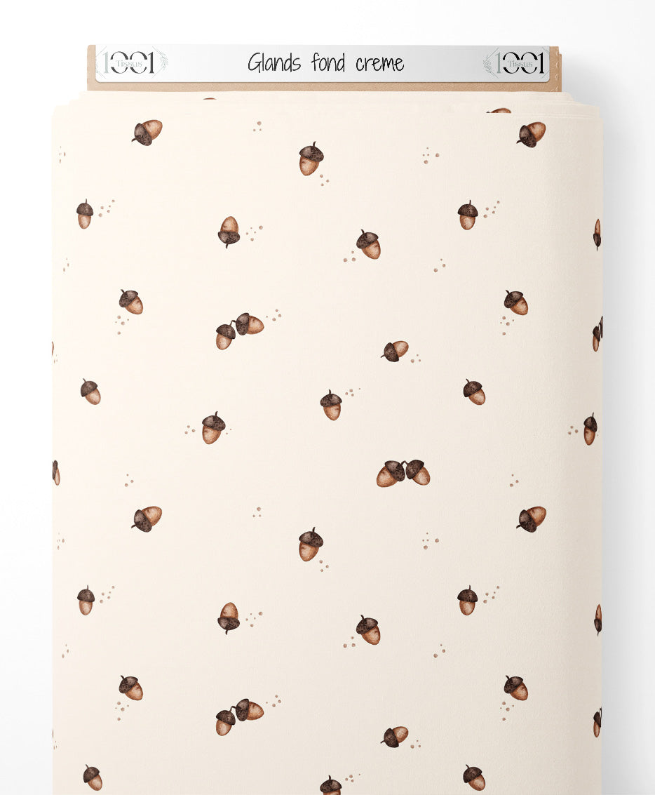 Les glands sont de couleur marron avec des nuances plus foncées. Les petites taches autour des glands ajoutent un détail subtil au motif.Les tissus