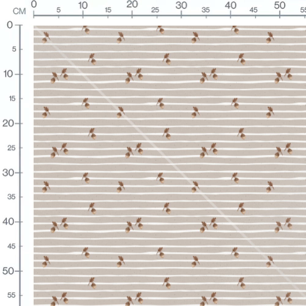Les glands sont accompagnés de petites feuilles marron. Le fond présente des rayures alternées beige et blanc, créant un motif doux et naturel.Les tissus