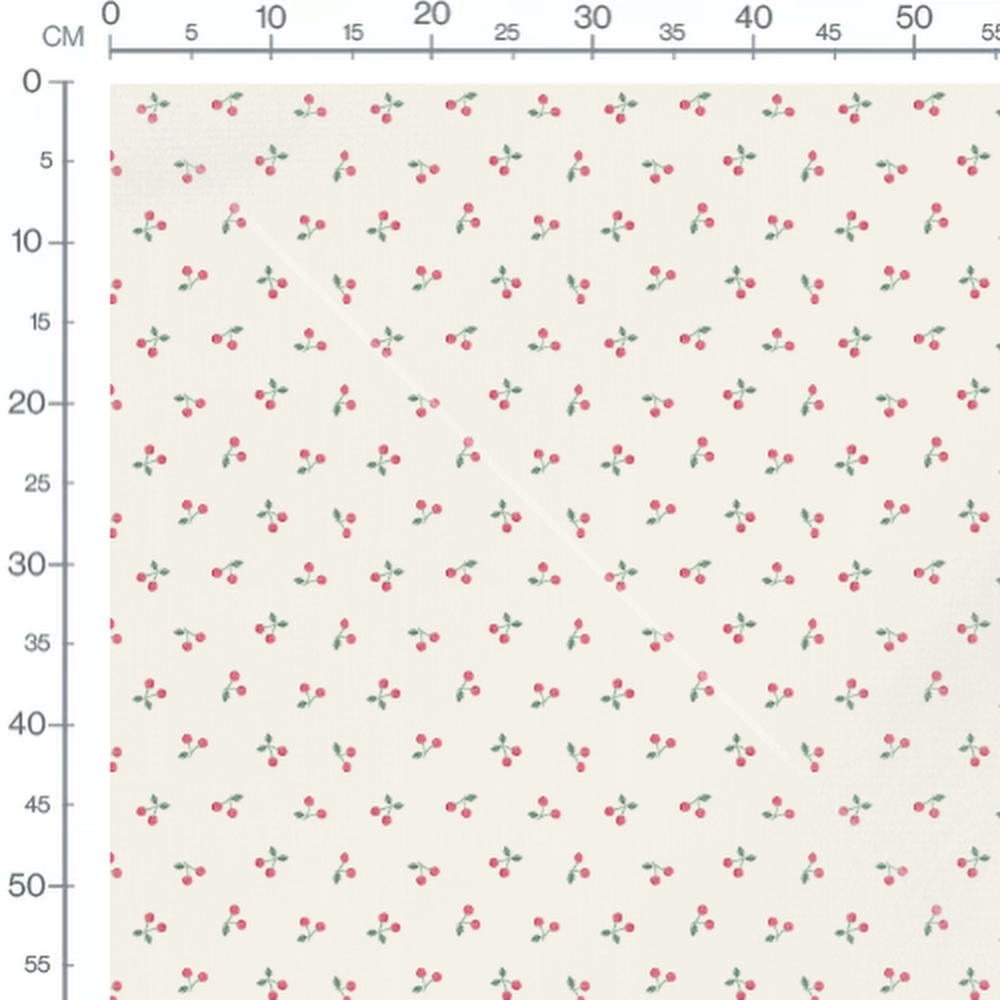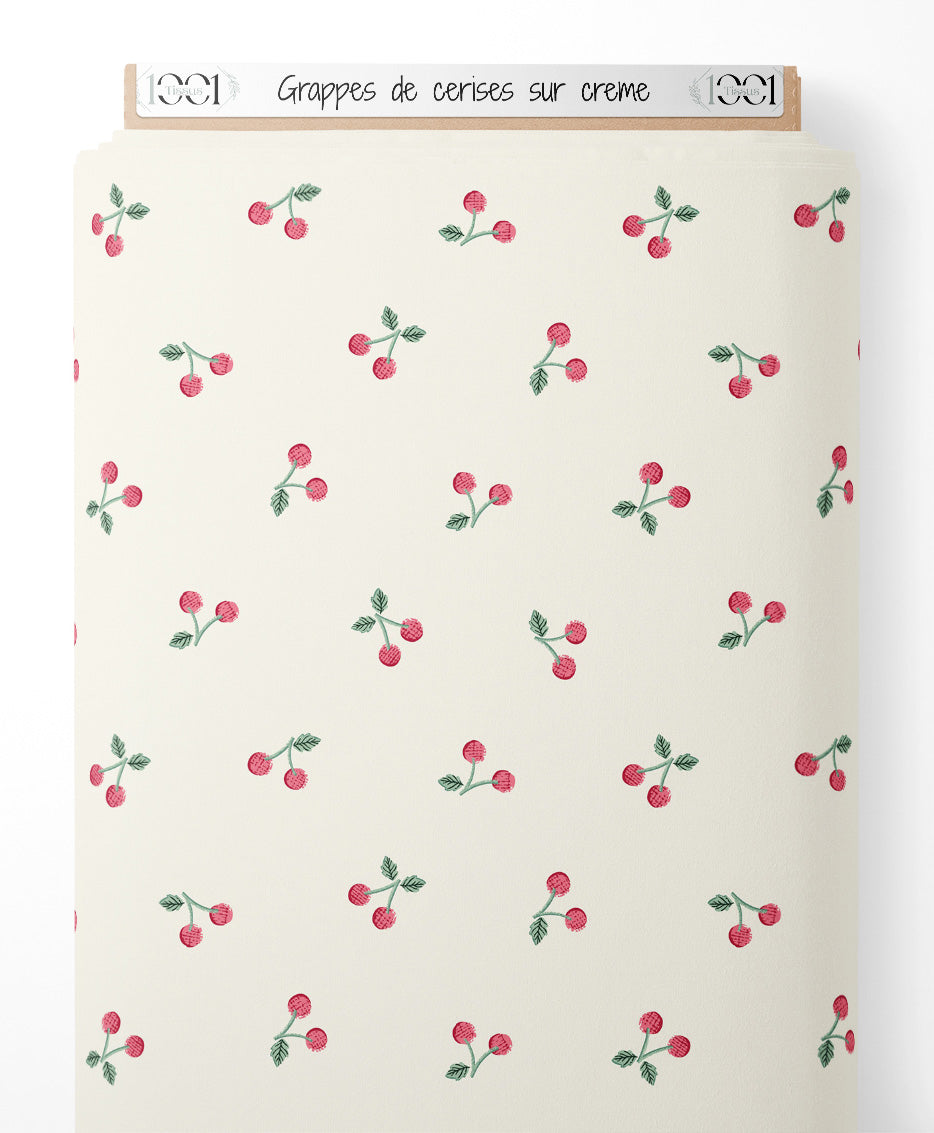 Les cerises sont dessinées avec des détails fins et accompagnées de petites feuilles vertes. Le fond crème met en valeur les couleurs vives des cerises.Les tissus