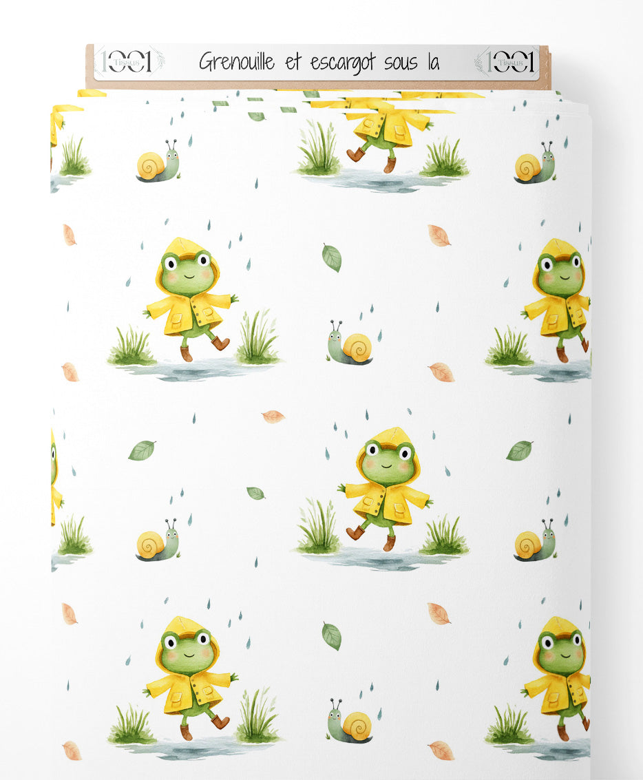 Les grenouilles portent des imperméables jaunes et sont accompagnées d'escargots. Des gouttes de pluie tombent autour d'eux. Des feuilles vertes et brunes parsèment le fond blanc.Les tissus