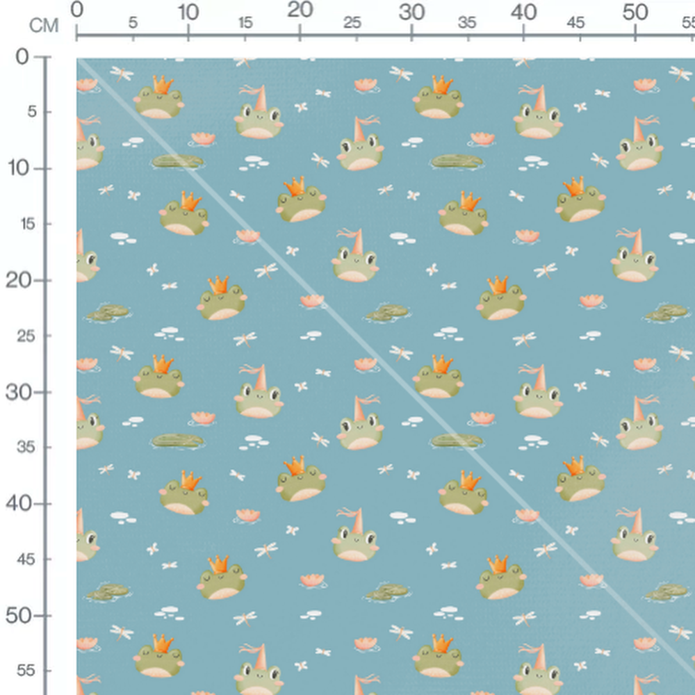 Les grenouilles portent des couronnes orange et des chapeaux roses. Des nénuphars roses flottent à côté de libellules blanches.Les tissus