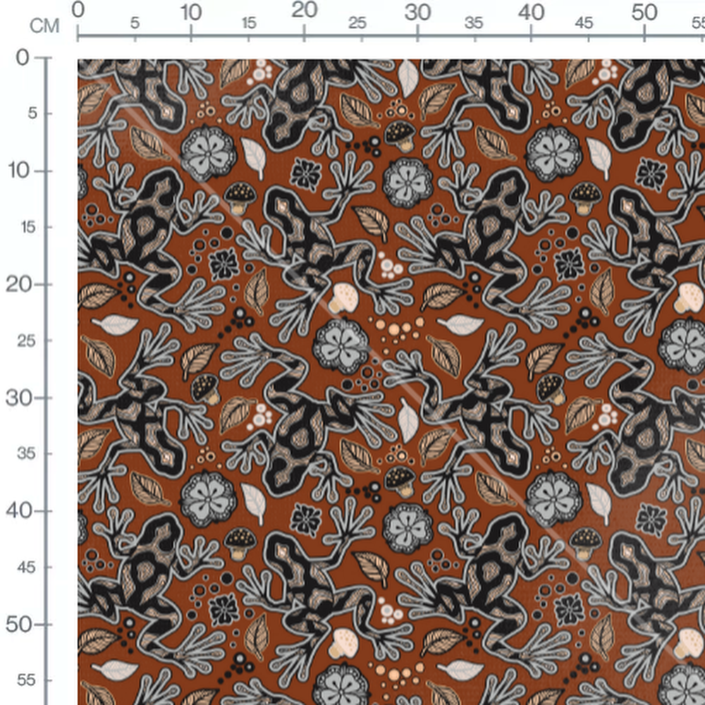 Les grenouilles présentent des motifs géométriques noirs et blancs. Les feuilles sont dispersées parmi des fleurs grises et des champignons beige. Des petits points noirs complètent le motif.Les tissus