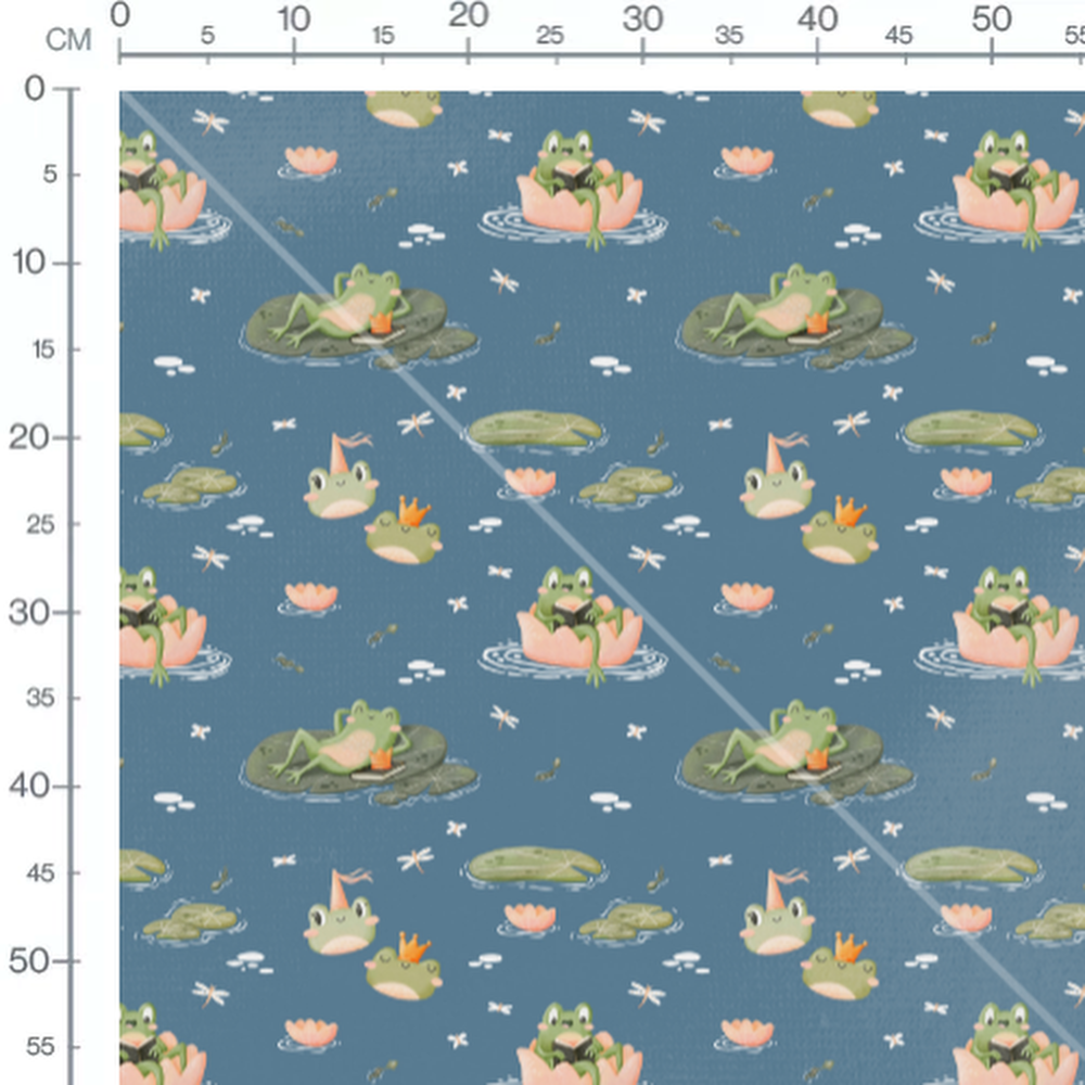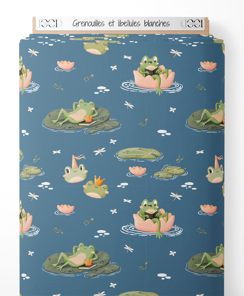 Les grenouilles portent des accessoires comme des chapeaux et des couronnes. Des fleurs de lotus roses flottent sur l'eau. Des libellules blanches volent autour des nénuphars.Les tissus