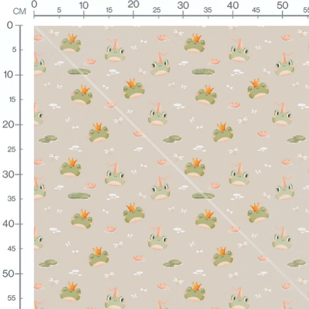 Les grenouilles portent des couronnes orange et sourient. Des libellules volent près des fleurs roses et des nénuphars verts.Les tissus