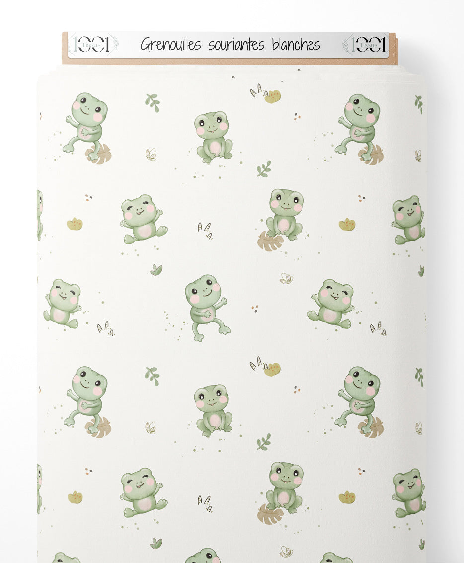 Les grenouilles ont des joues roses et des expressions joyeuses. De petites empreintes et feuilles ajoutent des détails subtils au motif.Les tissus