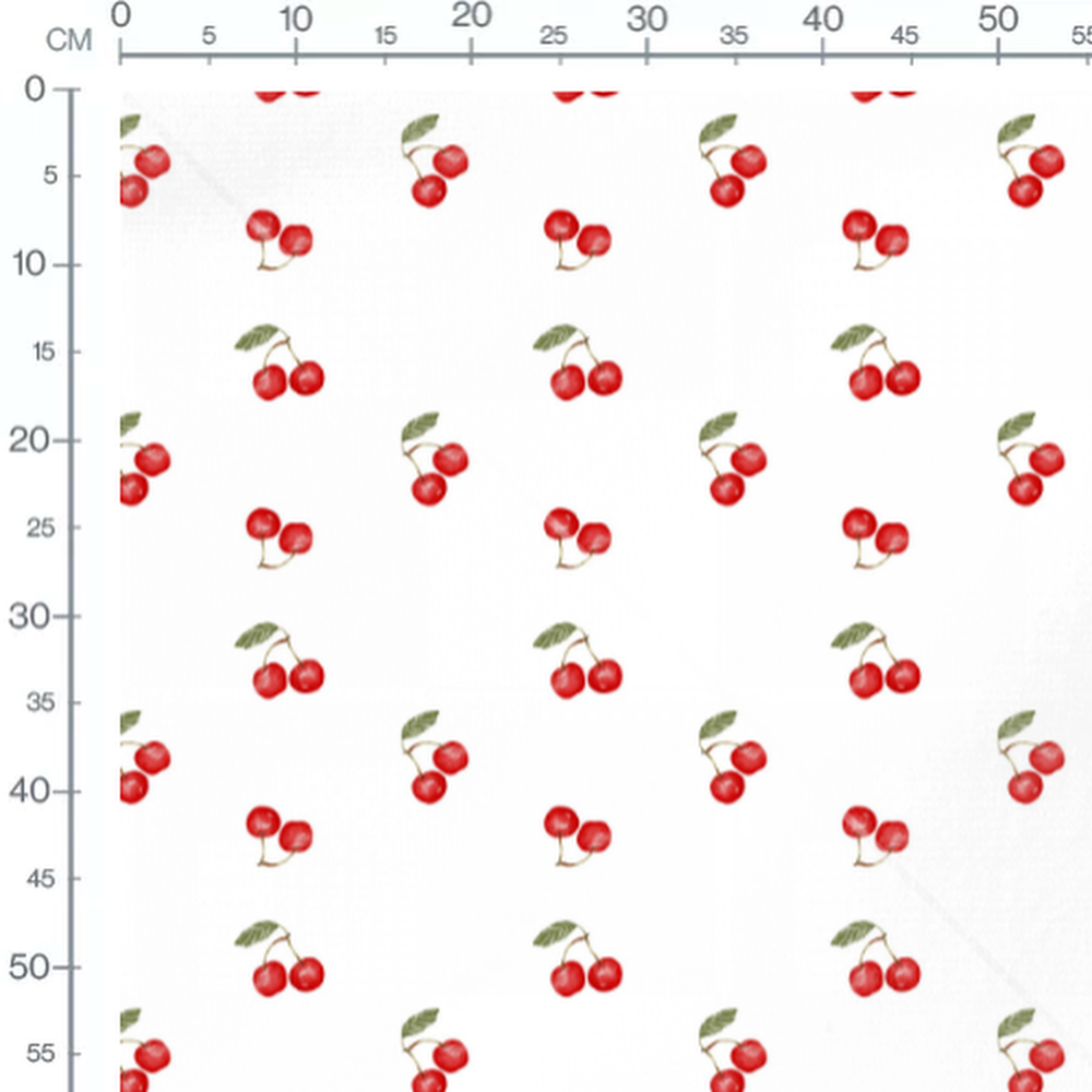 Chaque groupe de cerises est composé de deux fruits rouges. Les feuilles sont d'un vert doux et accompagnent chaque paire de cerises.Les tissus