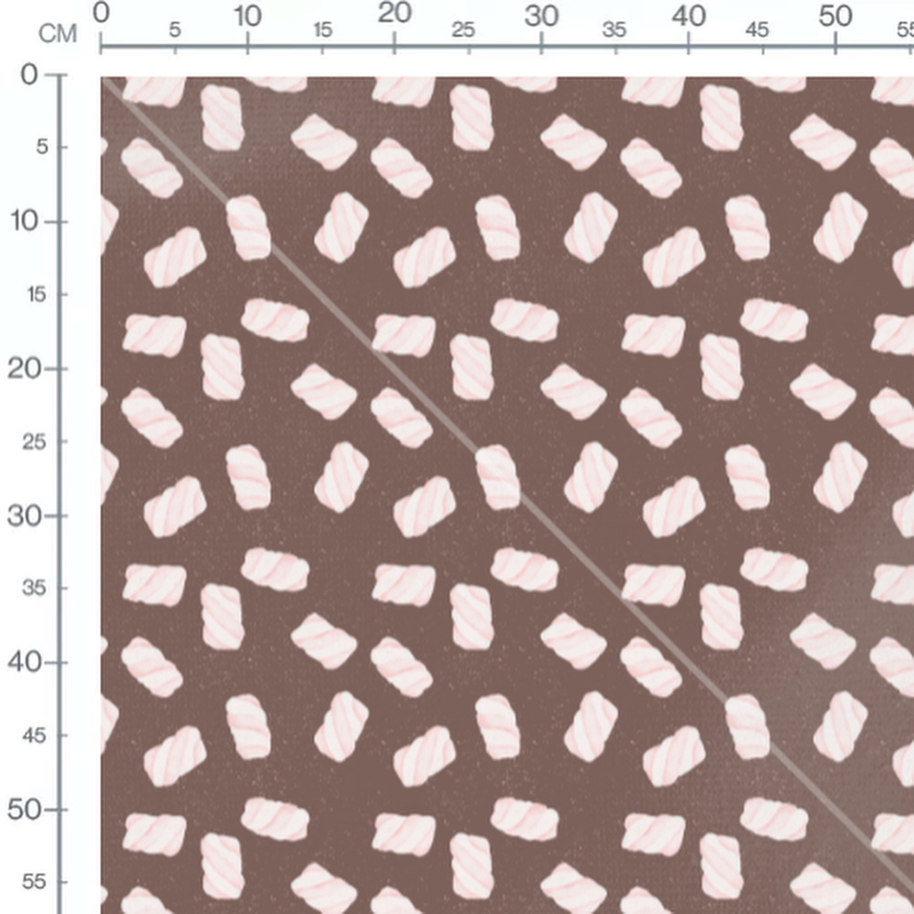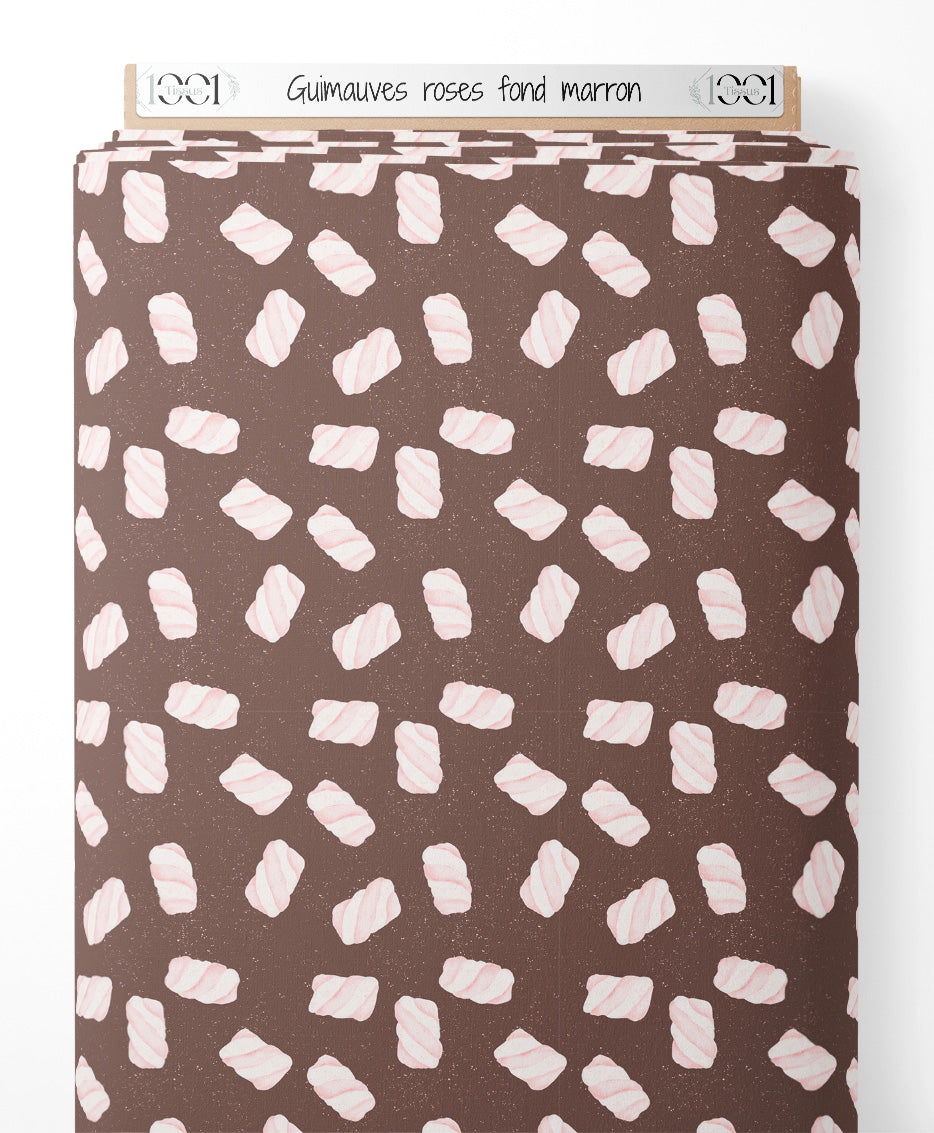 Guimauves roses et blanches sur fond marron. Motif répétitif de friandises en spirale.Les tissus