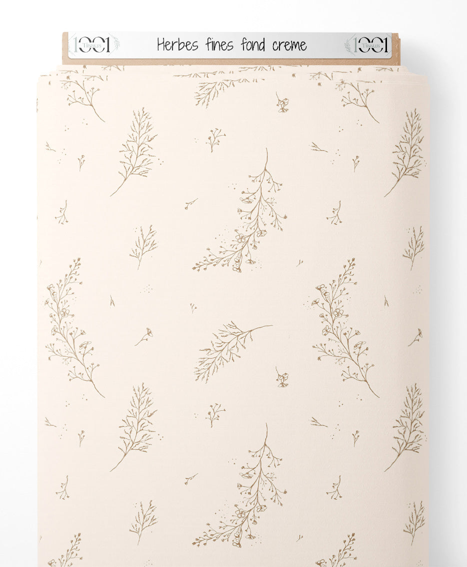 Les herbes sont dessinées avec des lignes fines et élégantes. Le fond crème met en valeur les détails subtils des motifs végétaux. Les nuances de beige ajoutent une touche naturelle et apaisante.Les tissus
