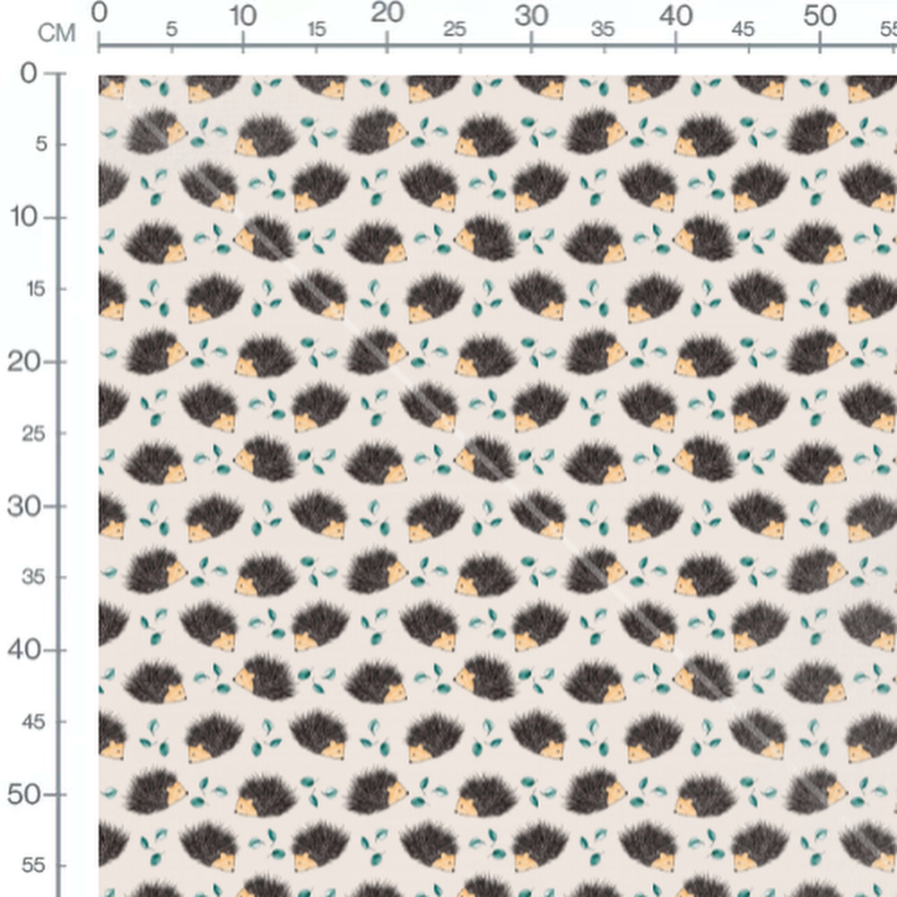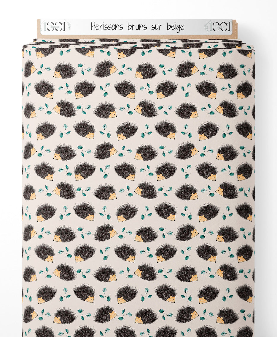 Les hérissons sont dessinés avec des piquants noirs et des visages bruns. Les feuilles vertes ajoutent une touche de couleur au motif. Le fond beige met en valeur les éléments du motif.Les tissus