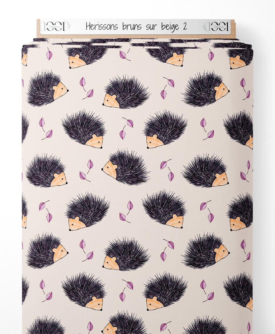 Les hérissons sont dessinés avec des piquants noirs et des visages bruns. Les feuilles violettes ajoutent une touche de couleur au motif.Les tissus