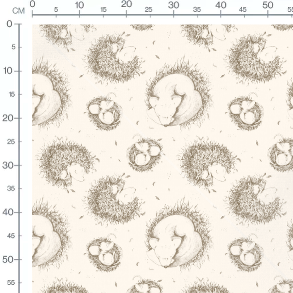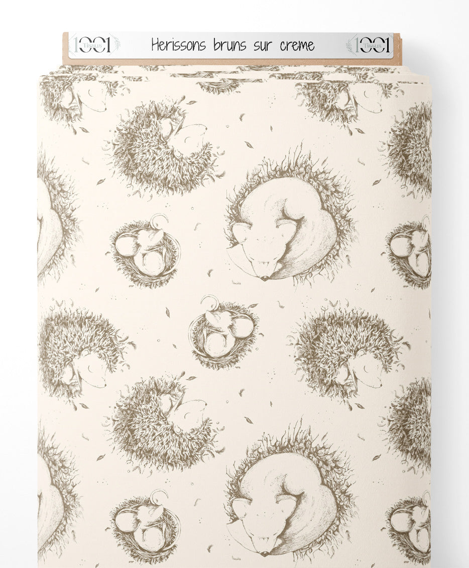 Les hérissons sont représentés en position endormie. Le motif inclut des détails de fourrure et de petites feuilles dessinées.Les tissus