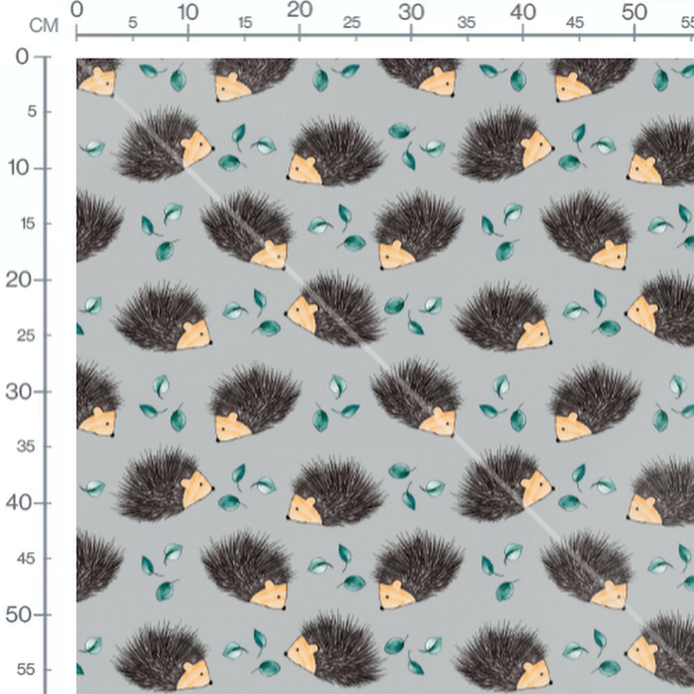 Les hérissons ont des piquants bruns et des visages beiges. Les feuilles sont de différentes nuances de vert. Le fond gris met en valeur les motifs de hérissons et de feuilles.Les tissus