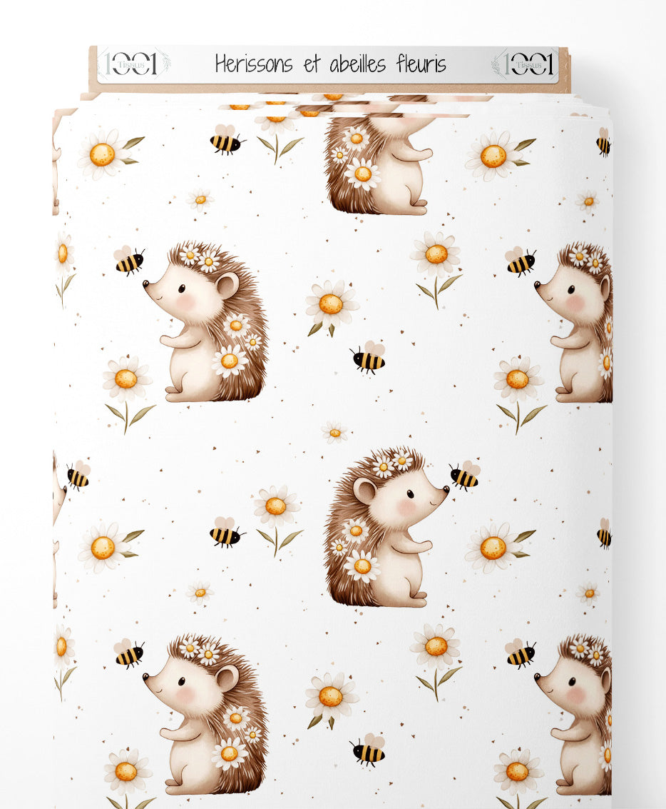 Les hérissons sont ornés de petites fleurs blanches. Des abeilles volent autour des marguerites jaunes et blanches. Le fond est blanc avec de petites taches brunes.Les tissus
