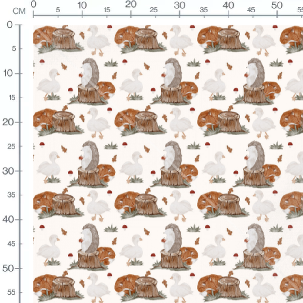Les hérissons sont posés sur des souches d'arbres. Les canards blancs sont entourés de petits champignons rouges et de feuillages verts.Les tissus