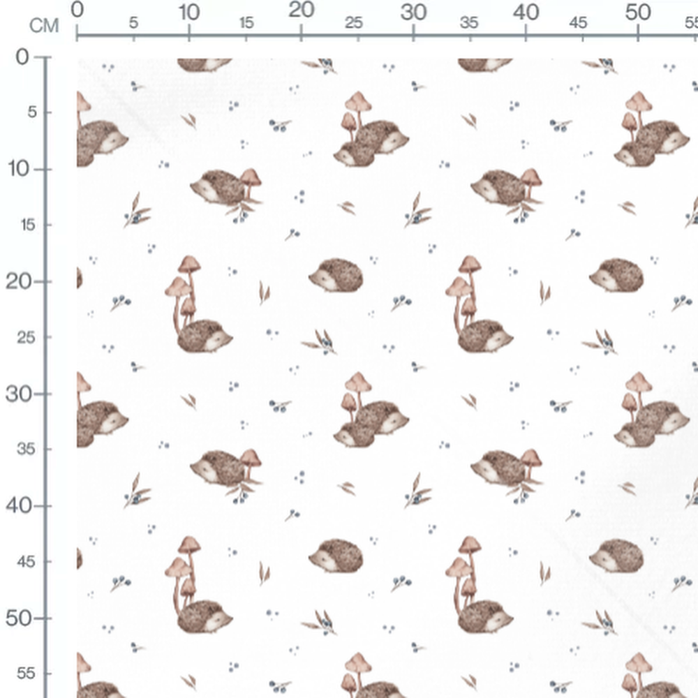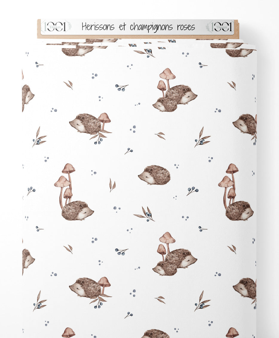 Les hérissons sont dessinés dans des tons bruns doux. Les champignons sont de couleur rose pâle. De petites baies bleues et des feuilles brunes ajoutent des détails subtils.Les tissus