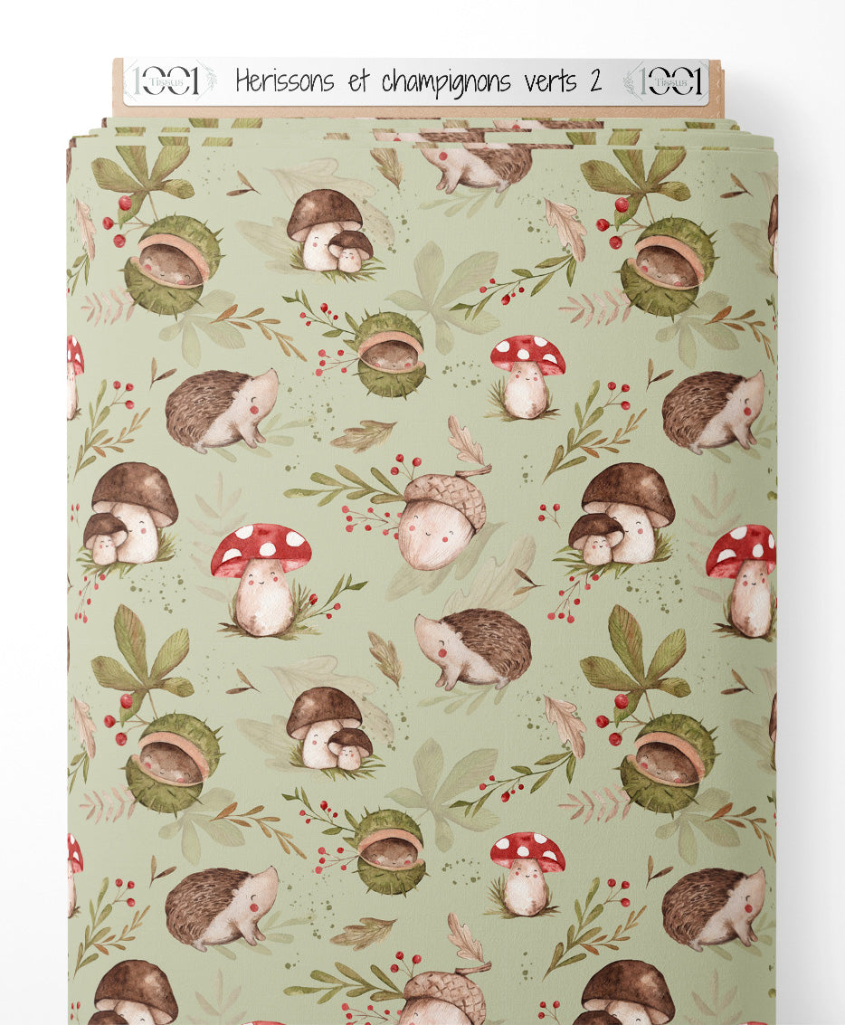 Les hérissons sont entourés de champignons bruns et rouges. Des feuilles vertes et des baies rouges complètent le motif. Les marrons sont ouverts montrant leurs fruits. Le fond vert clair ajoute une touche naturelle.Les tissus
