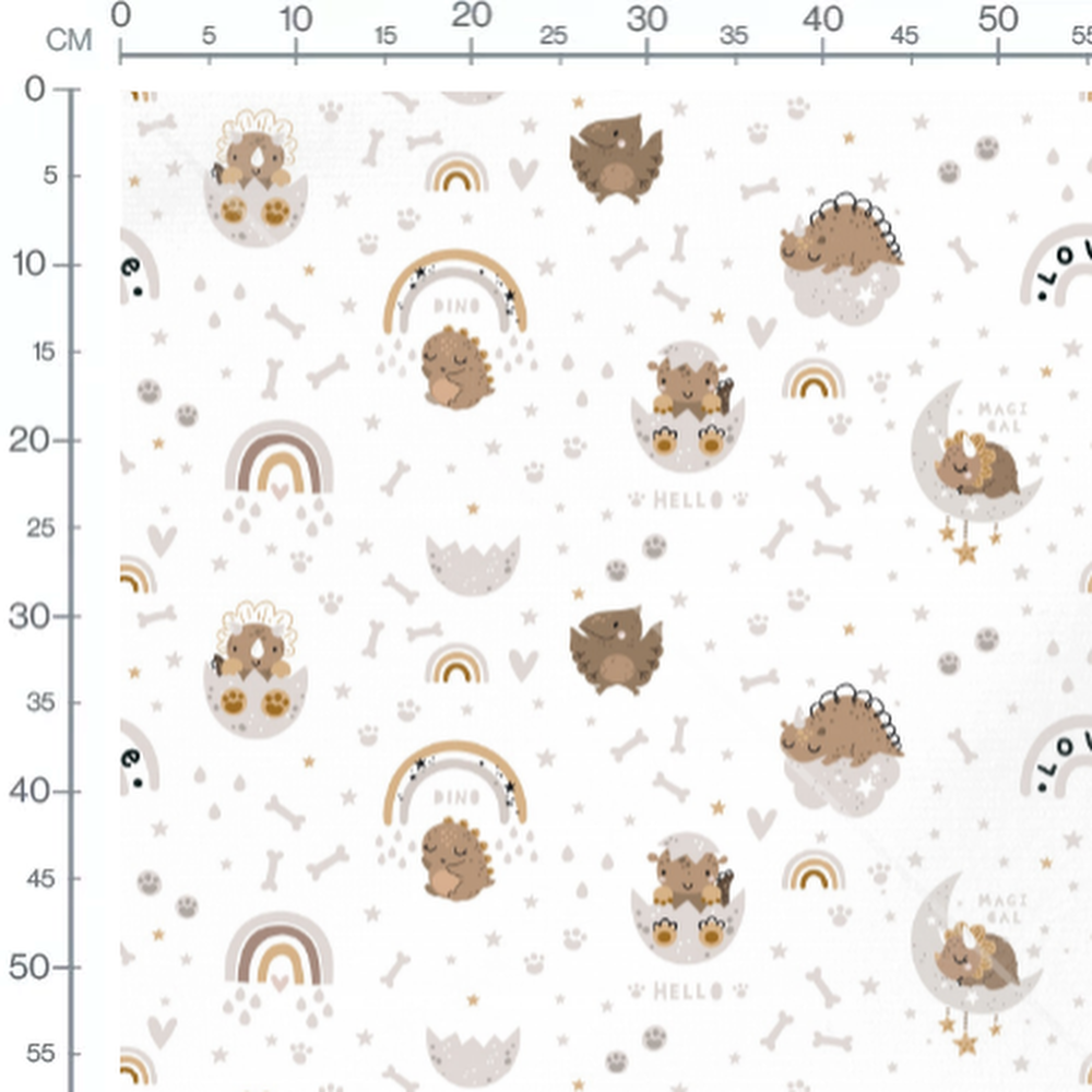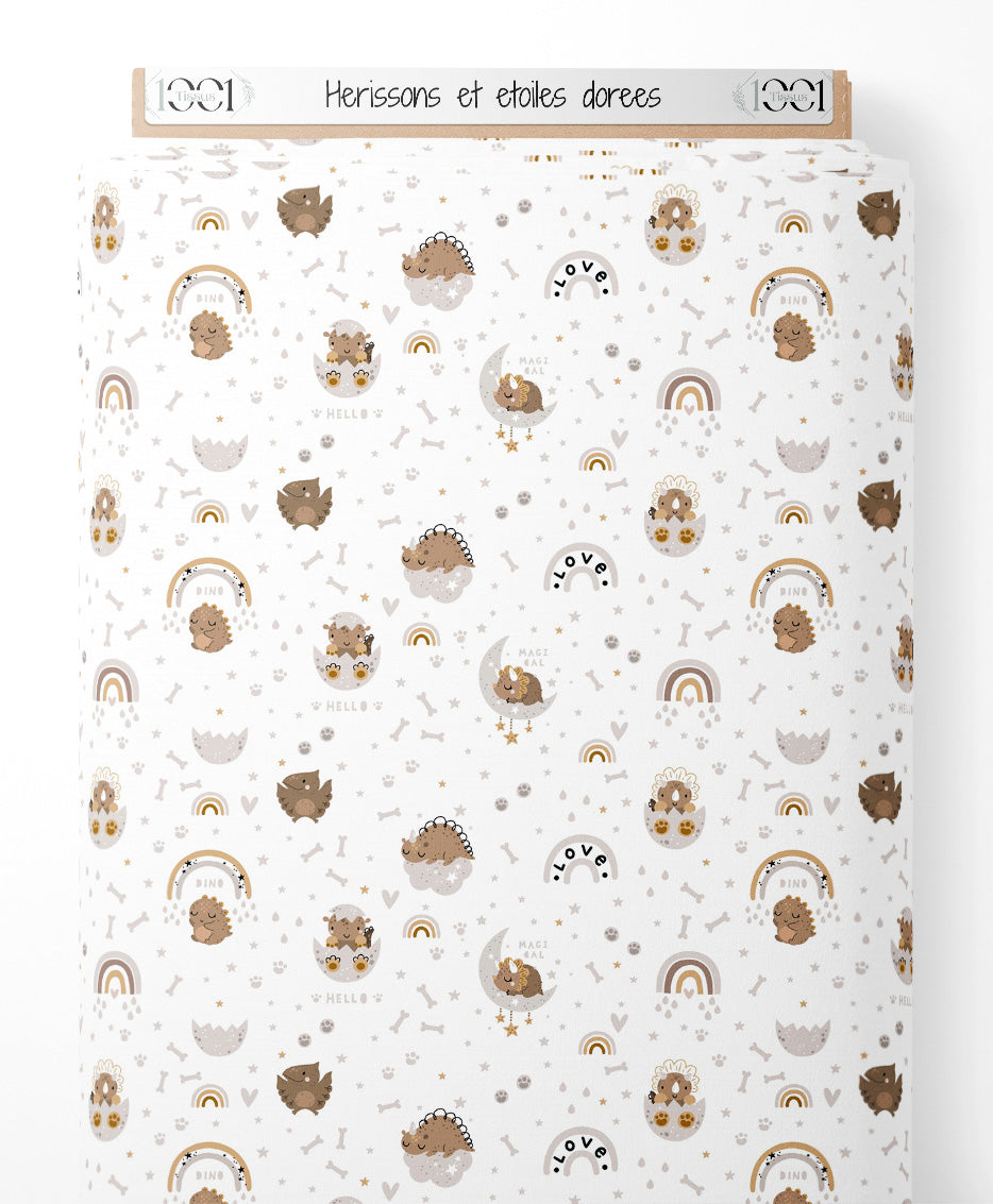 Petites empreintes de pattes et gouttes de pluie autour des hérissons. Étoiles dorées et inscriptions ajoutent une touche ludique. Nuances de beige et gris dominent le motif.Les tissus