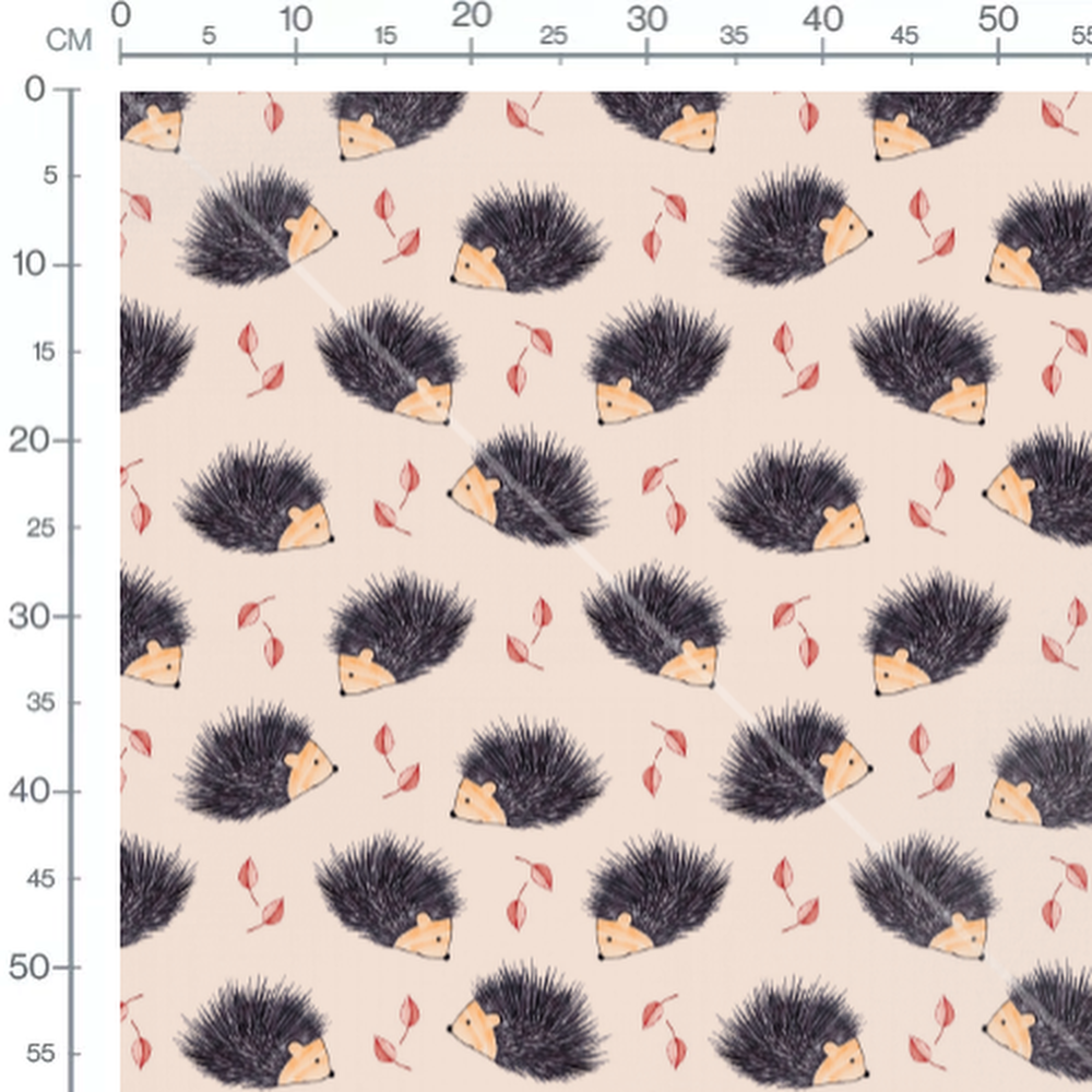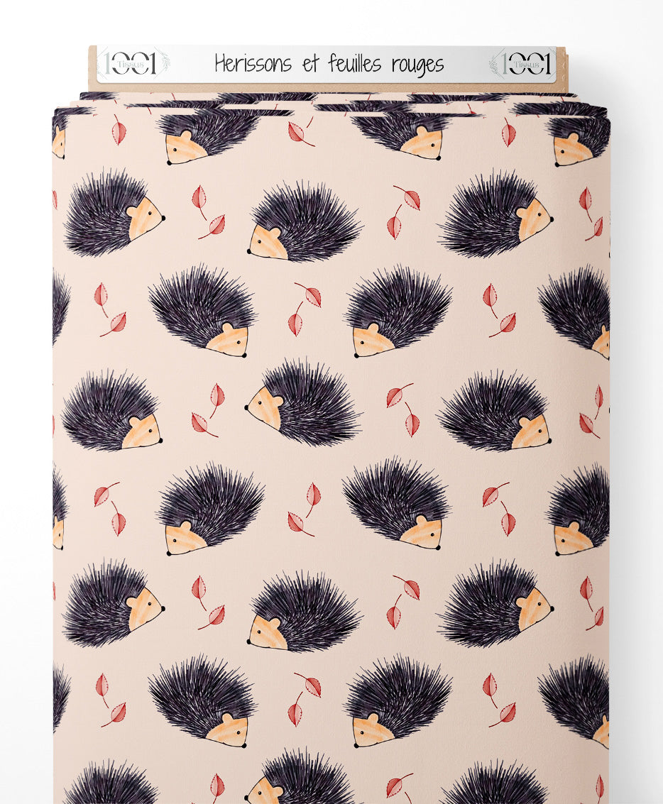 Les hérissons sont dessinés avec des piquants noirs et des visages bruns. Les feuilles rouges ajoutent une touche de couleur au motif.Les tissus