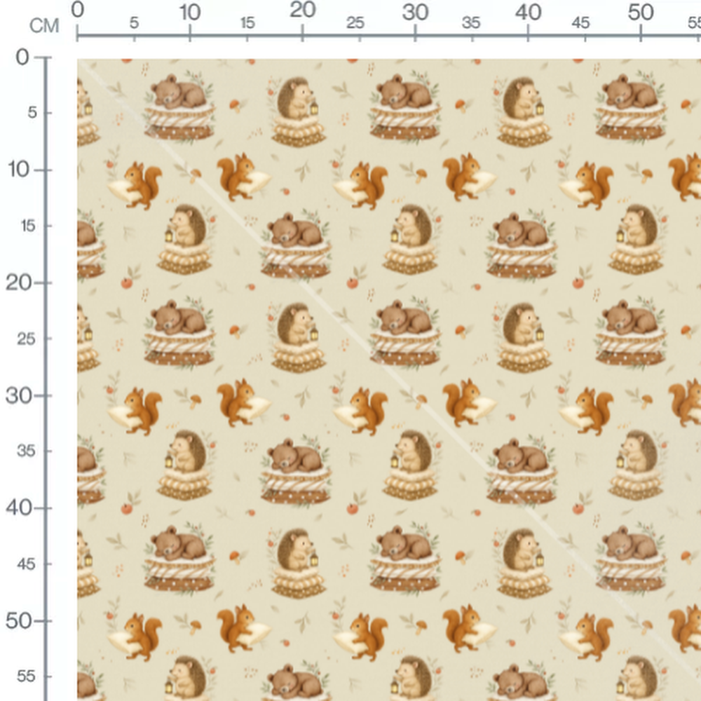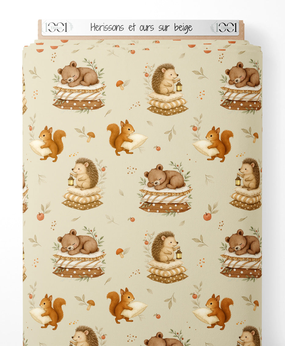 Les hérissons tiennent des lanternes et sont assis sur des coussins. Les écureuils tiennent des oreillers. Les ours bruns dorment paisiblement sur des piles de coussins. Petits champignons et feuilles dispersés sur le fond.Les tissus
