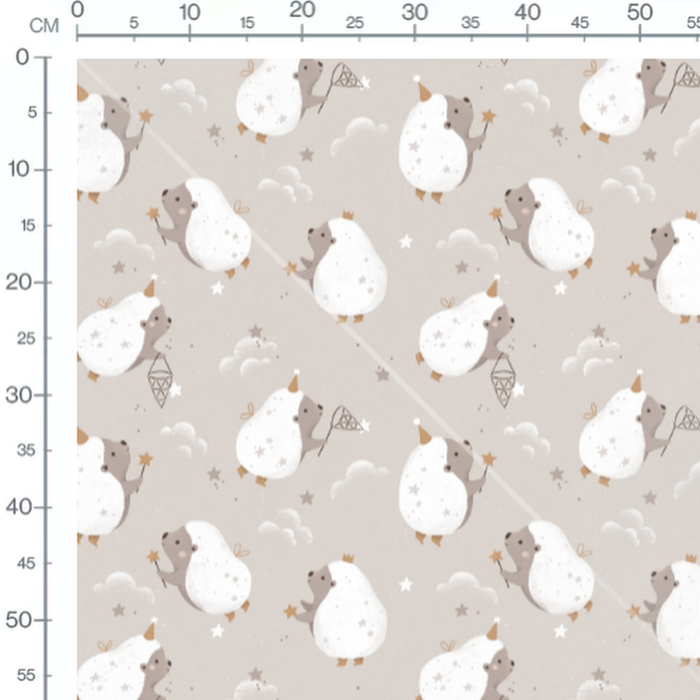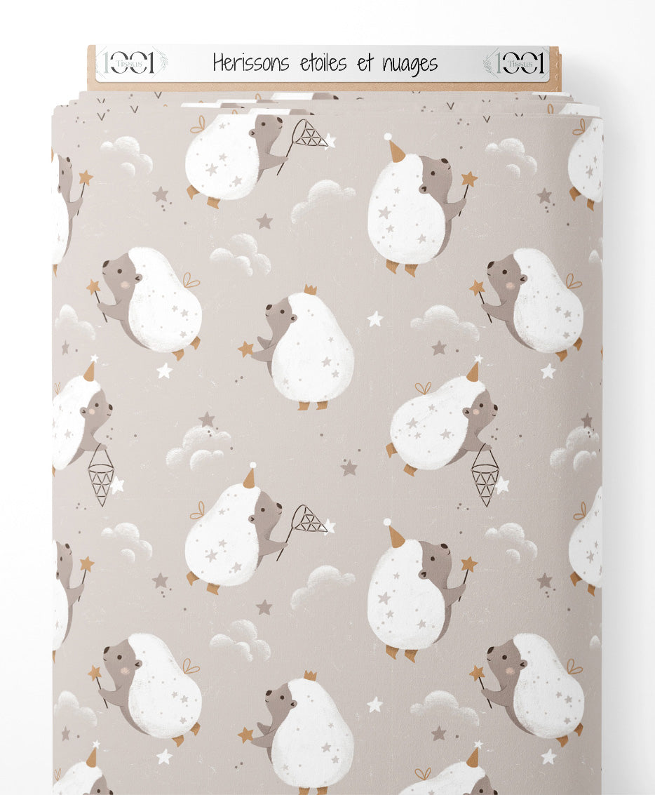 Les hérissons portent des chapeaux et tiennent des lanternes. Des étoiles et des nuages complètent le motif dans des tons doux et neutres.Les tissus