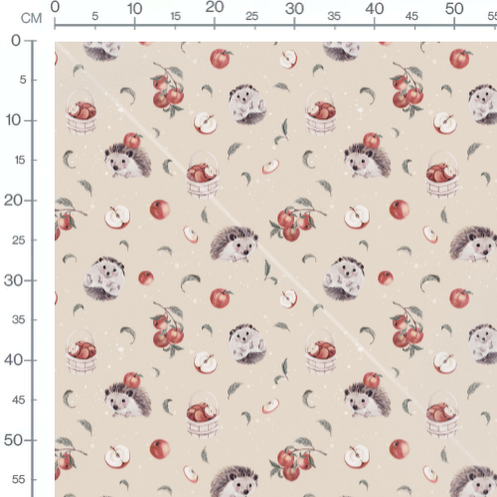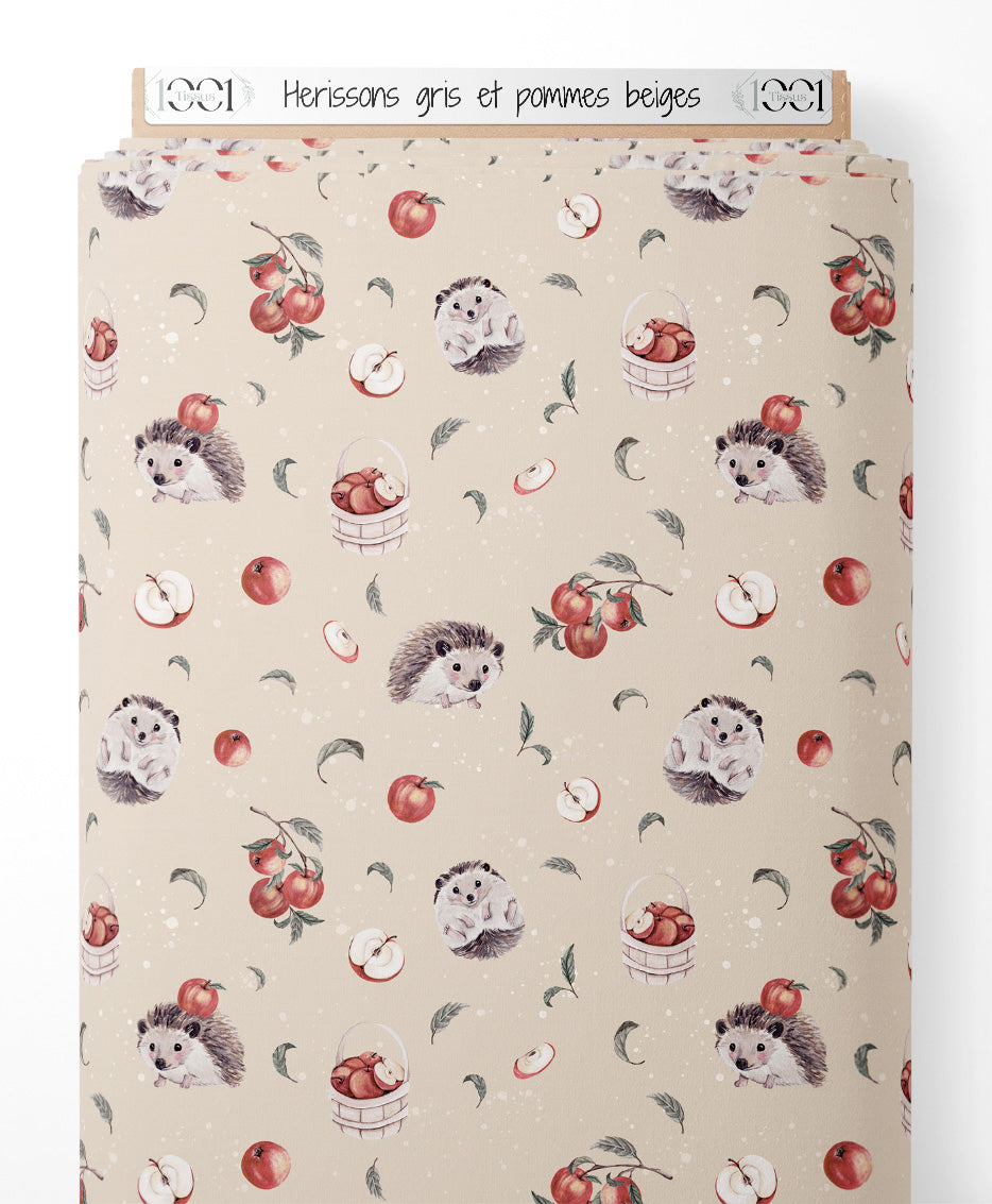 Tissu - Hérissons gris et pommes beiges