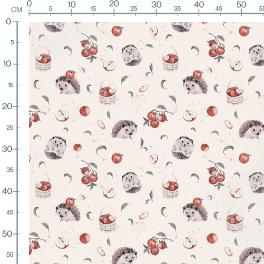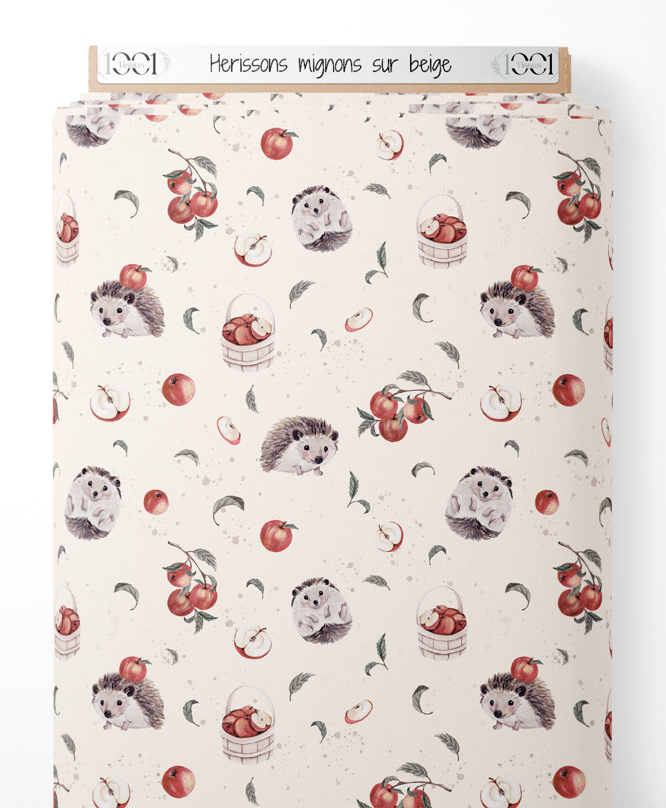 Les hérissons sont dessinés avec des détails réalistes. Les pommes rouges sont entières ou coupées en tranches. Les paniers contiennent des pommes et ajoutent une touche champêtre. Les feuilles vertes sont dispersées autour des éléments principaux.Les tissus