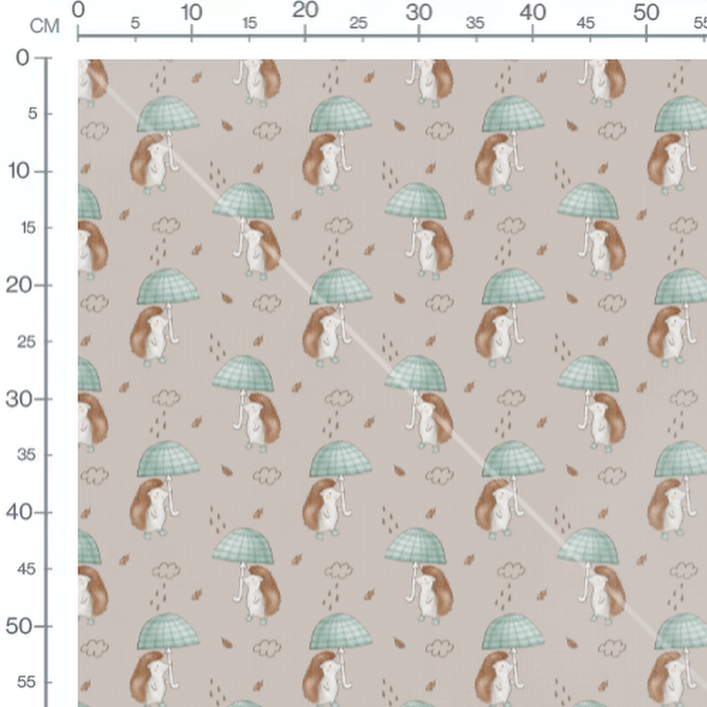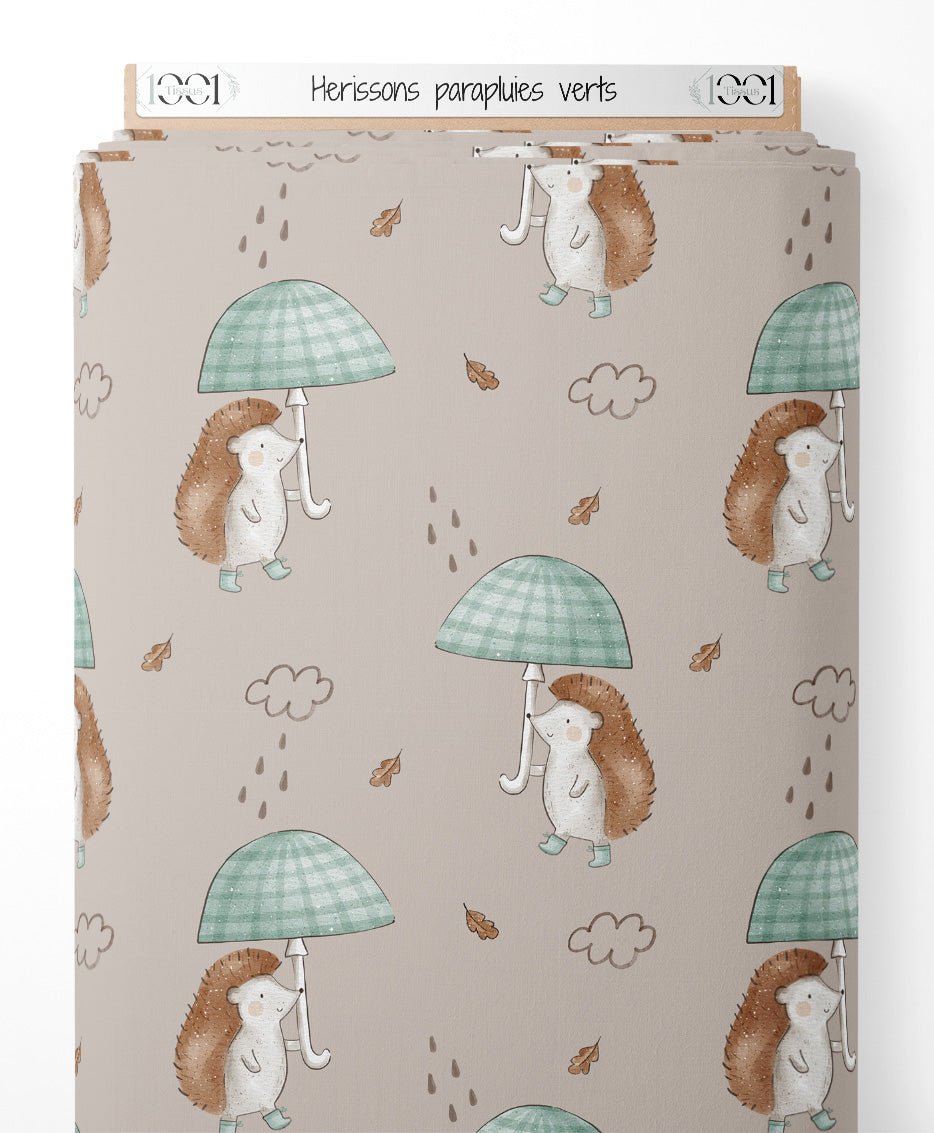 Les hérissons portent des bottes bleues et tiennent des parapluies à carreaux verts. Des gouttes de pluie et des feuilles marron ajoutent des détails au motif. Les nuages gris clair complètent l'ambiance automnale.Les tissus