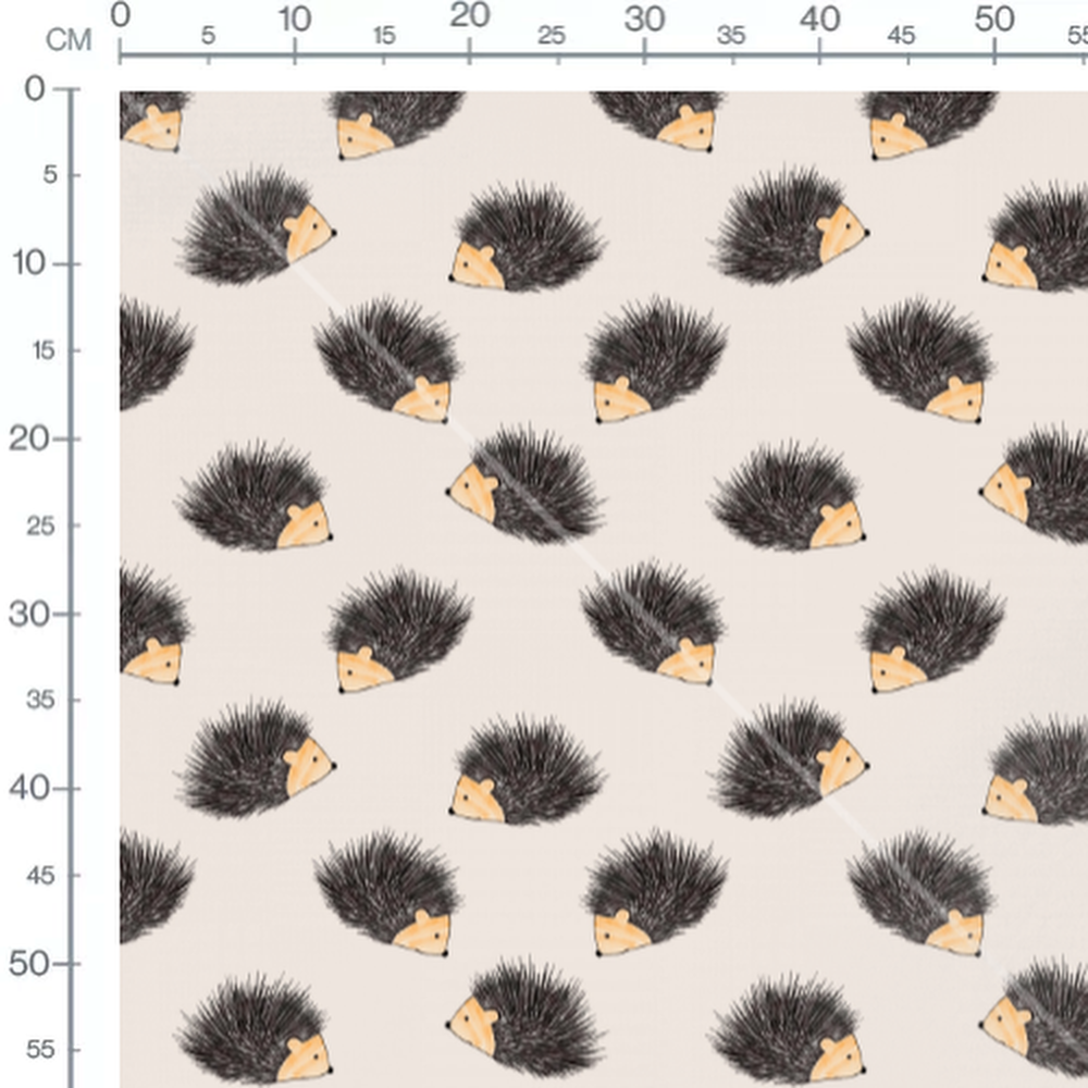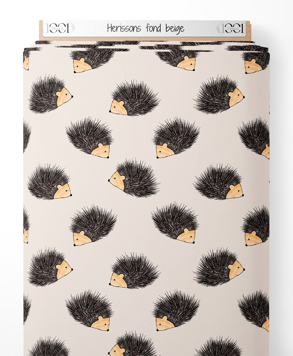Les hérissons sont dessinés avec des piquants noirs et des visages beiges. Le fond beige met en valeur les détails des hérissons.Les tissus