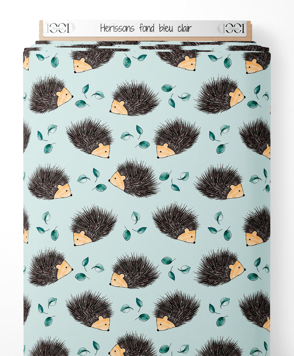 Les hérissons sont dessinés avec des piquants bruns et des visages beiges. Les feuilles vertes ajoutent une touche de nature au motif.Les tissus