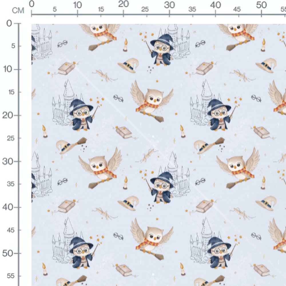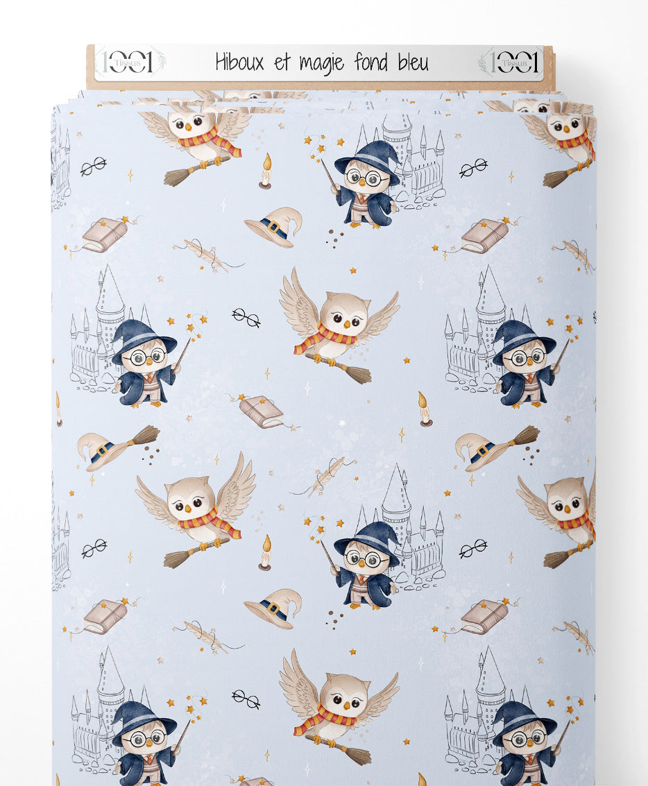 Les hiboux portent des écharpes rayées et des chapeaux de sorcier. Des baguettes magiques et des livres flottent autour des hiboux. Des châteaux et des lunettes ajoutent une touche magique au motif. Des étoiles et des bougies complètent l'ambiance enchantée.Les tissus