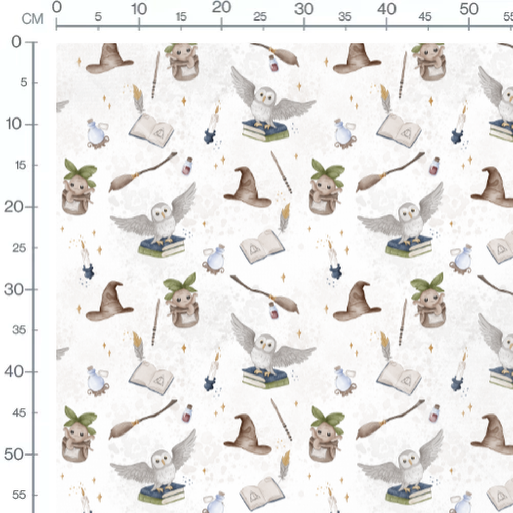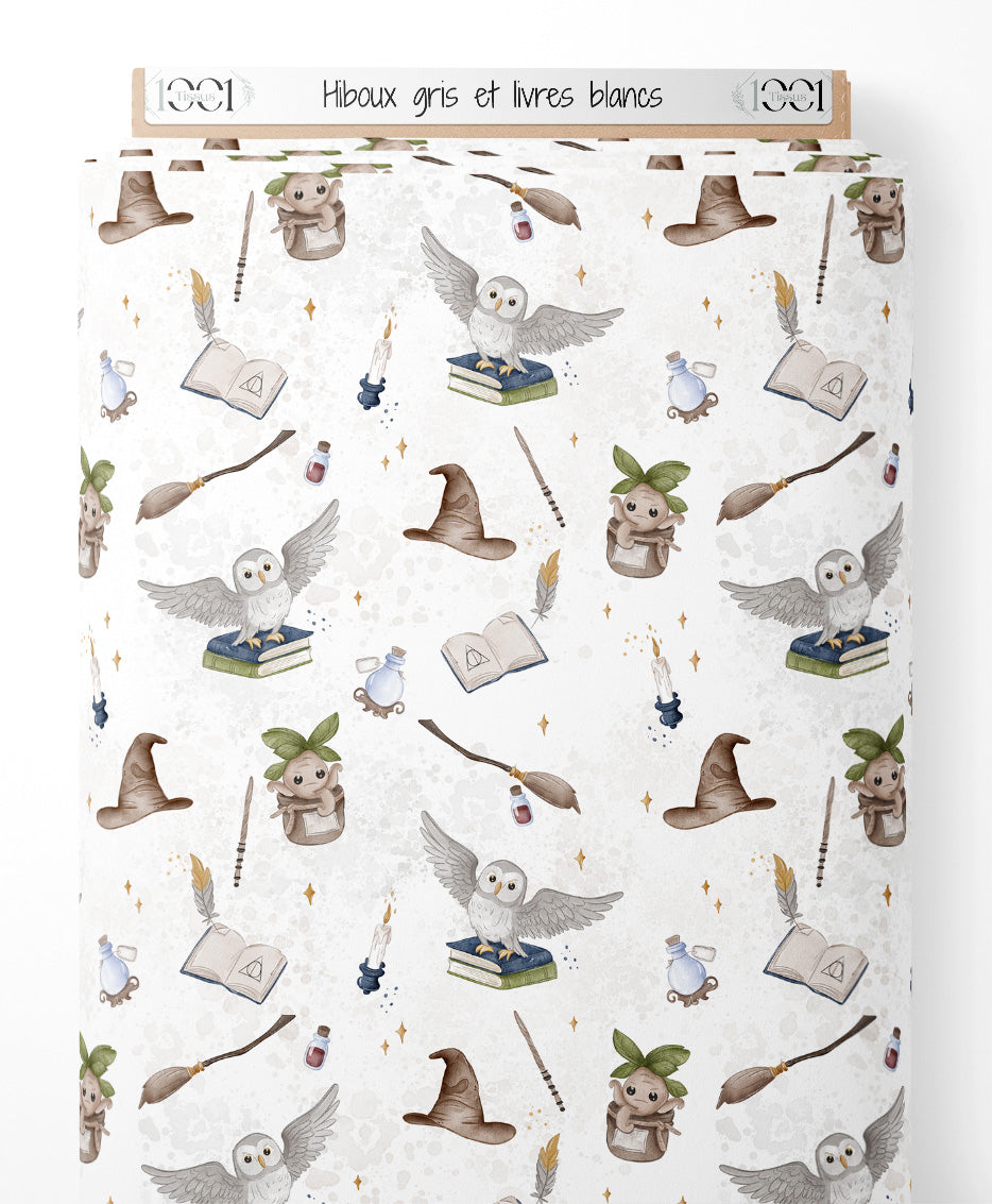 Des livres ouverts avec des plumes dorées sont dispersés. Des bougies allumées et des fioles de potion ajoutent une touche mystique. Des créatures avec des oreilles pointues et des feuilles sur la tête complètent le motif.Les tissus