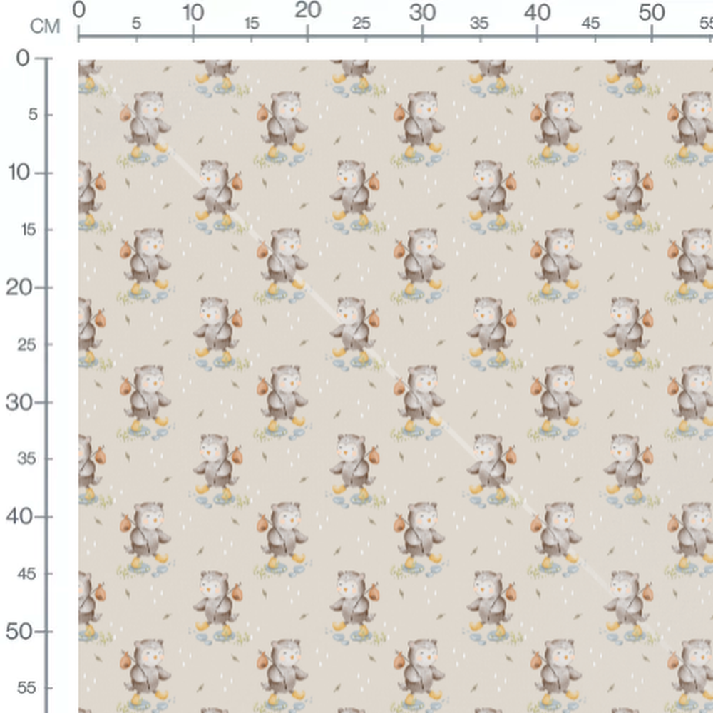 Les hiboux portent un baluchon orange et marchent sur des pierres bleues. Quelques brins d'herbe verte entourent les hiboux. Des gouttes blanches et des feuilles grises ajoutent des détails au fond beige.Les tissus