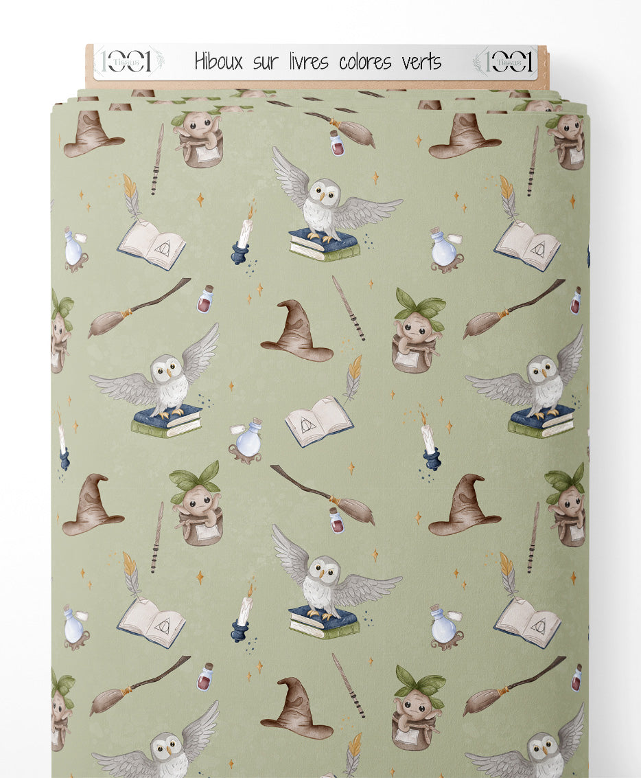 Tissu - Hiboux sur livres colorés verts