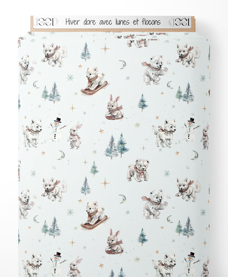 Les animaux portent des écharpes et jouent dans la neige. Un bonhomme de neige avec un chapeau noir est présent. Des sapins enneigés et des étoiles dorées complètent le motif. Des lunes et des flocons ajoutent une touche hivernale.Les tissus