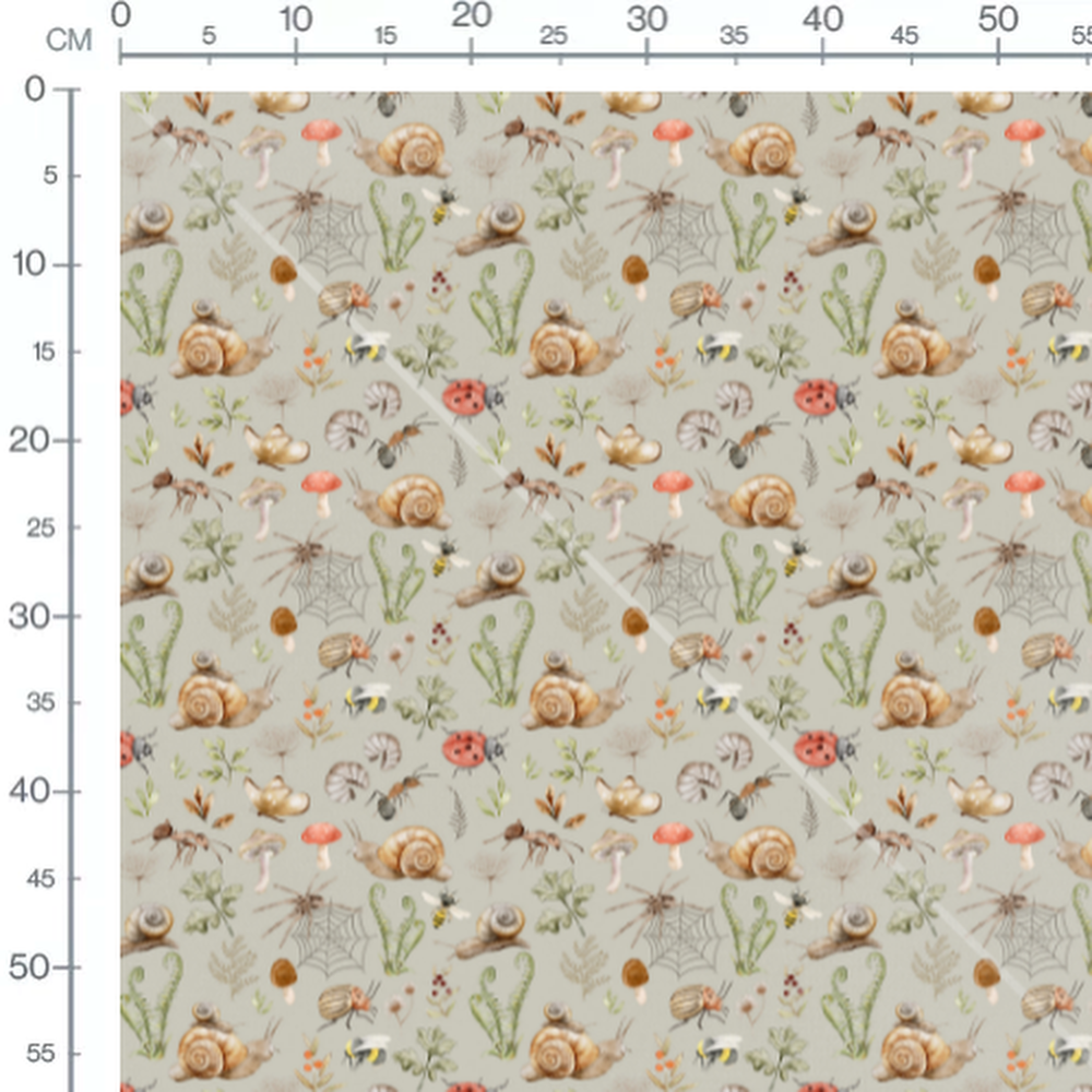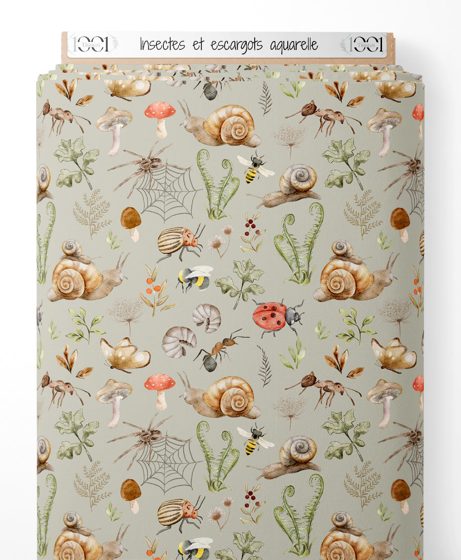 Les escargots sont accompagnés de divers insectes comme des abeilles et des coccinelles. Des champignons et des feuilles ajoutent une touche naturelle au motif. Les toiles d'araignée et les fougères complètent le design.Les tissus