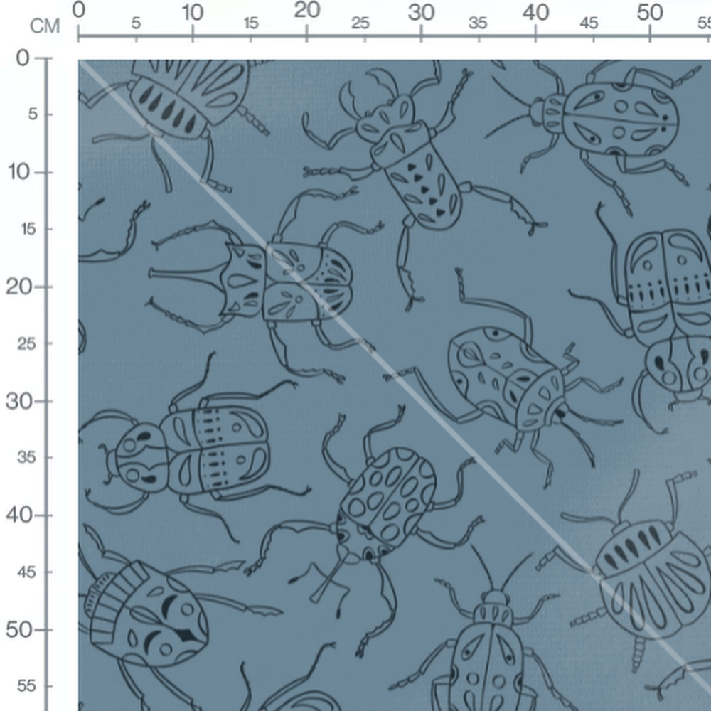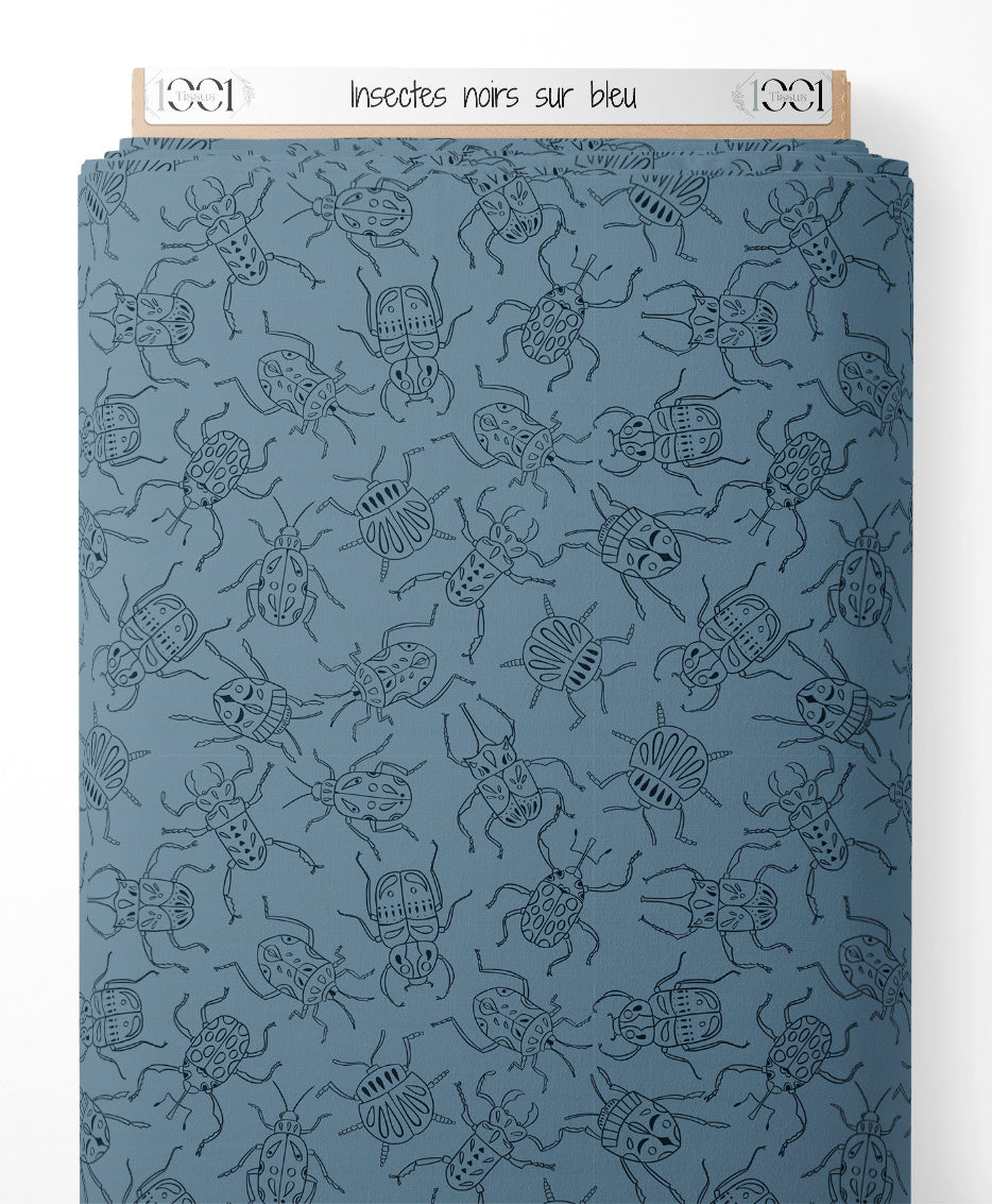 Les insectes présentent des motifs détaillés et stylisés. Chaque coléoptère a des motifs uniques sur son dos. Le fond bleu met en valeur les dessins noirs des insectes.Les tissus