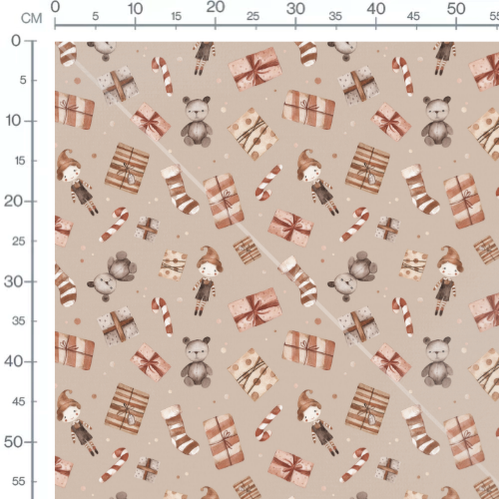 Les cadeaux sont emballés avec des motifs rayés et à pois. Les cannes à sucre sont rouges et blanches. Les lutins portent des chapeaux marron. Les ours en peluche sont gris et marron.Les tissus