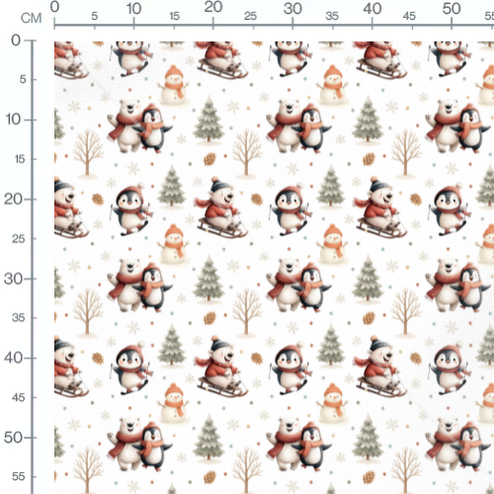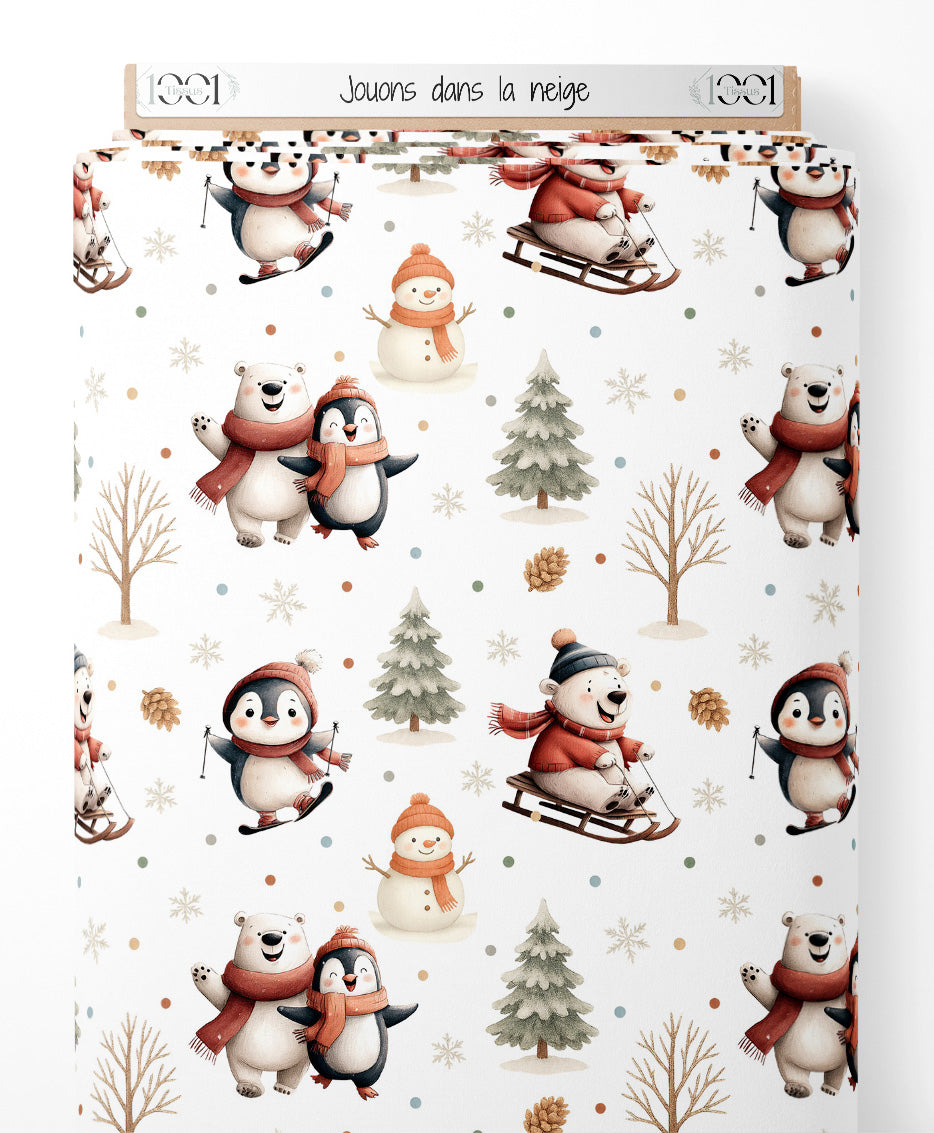 Les pingouins portent des écharpes rouges et jouent dans la neige. L'ours blanc est accompagné d'un pingouin souriant. Des sapins verts et des arbres nus parsèment le fond. Un bonhomme de neige arbore un chapeau et une écharpe orange. Des flocons de neige et des points colorés complètent le motif.Les tissus