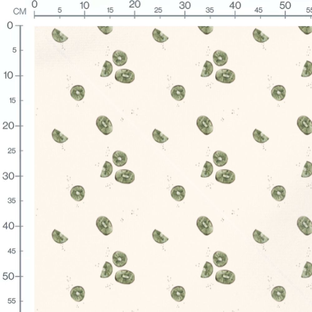 Les tranches de kiwi sont de couleur verte avec un cœur blanc. Le fond beige met en valeur les nuances vertes des fruits.Les tissus