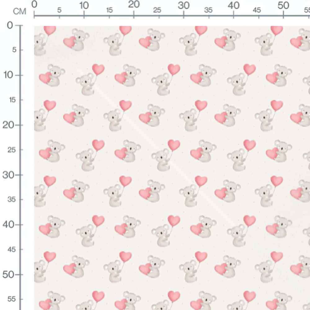 Les ballons en forme de cœur sont d'un rose doux. Les koalas ont une expression adorable et sont dessinés de manière simple. Le fond blanc met en valeur les couleurs douces des motifs.Les tissus