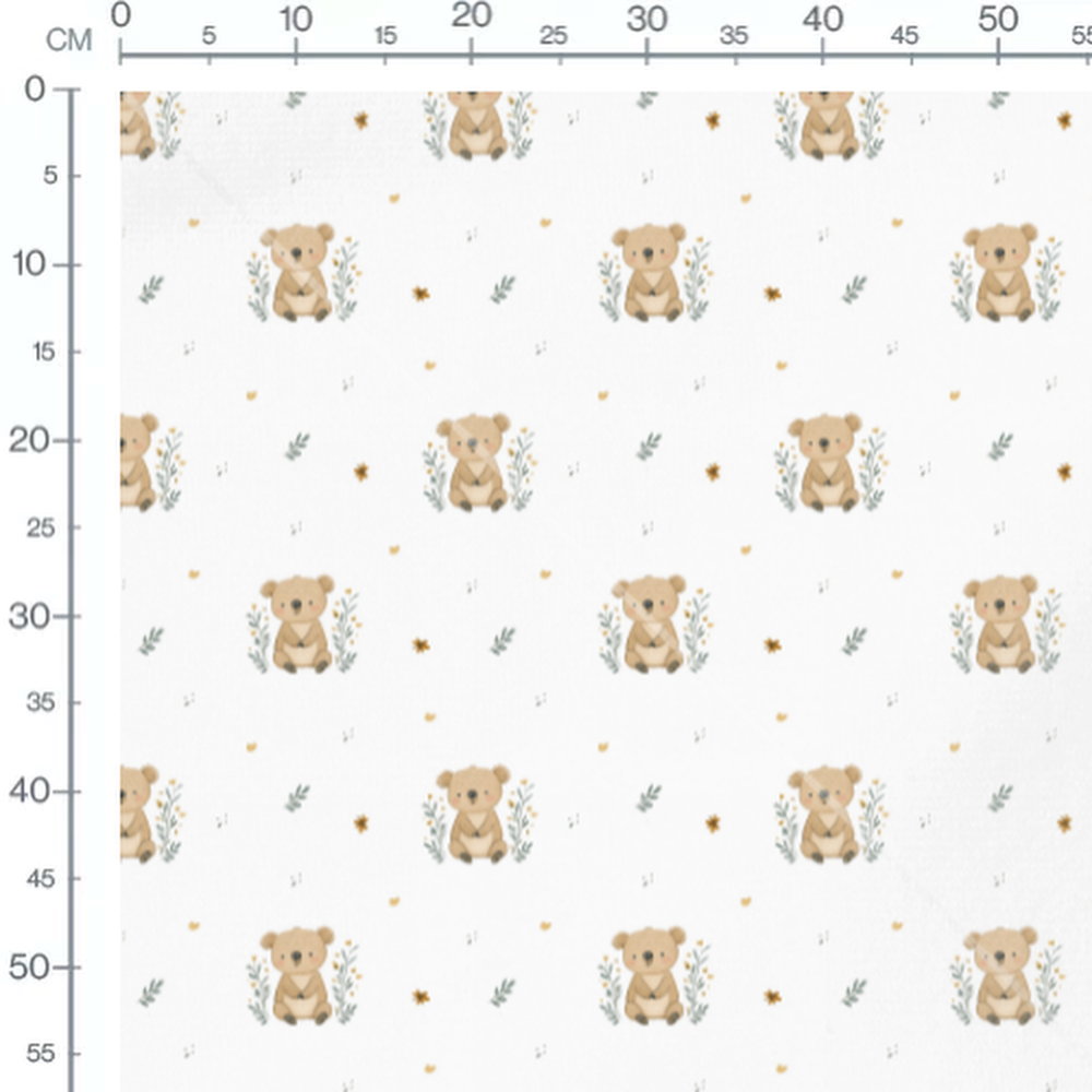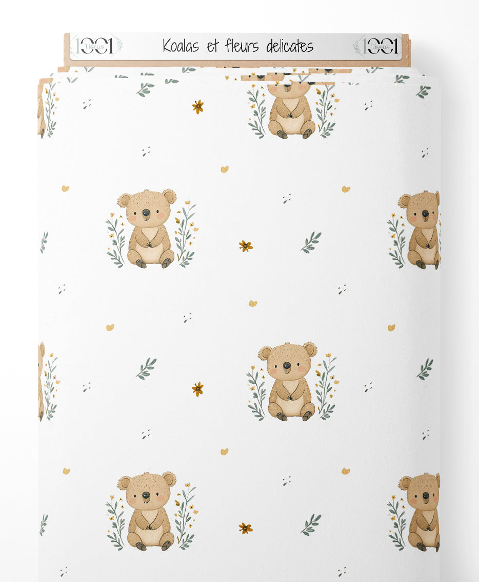Les koalas sont dessinés avec des détails doux et des expressions amicales. Les petites fleurs jaunes ajoutent une touche de couleur vive. Les feuilles vertes complètent le motif avec élégance.Les tissus