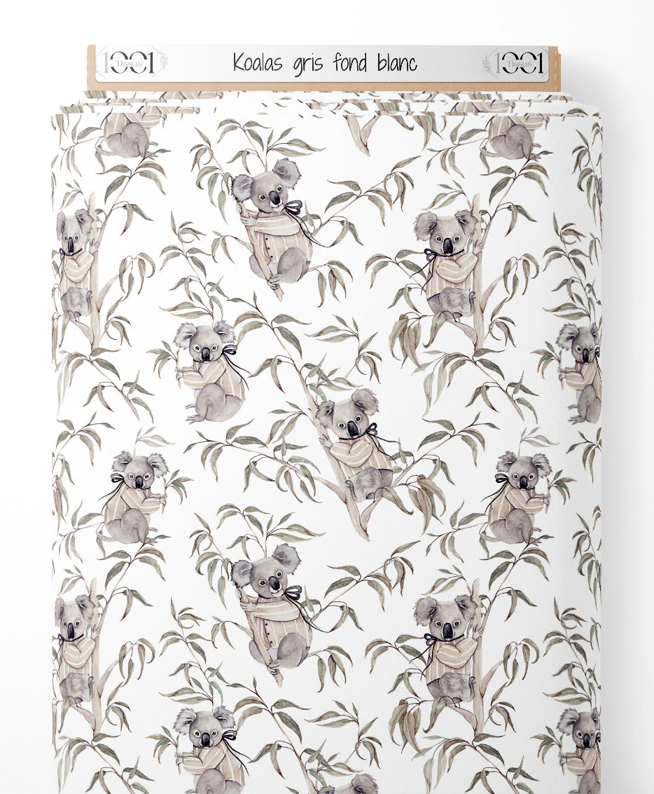Tissu - Koalas gris sur fond blanc