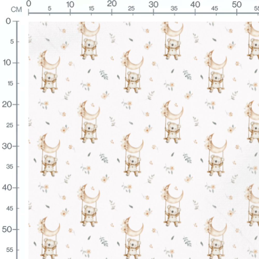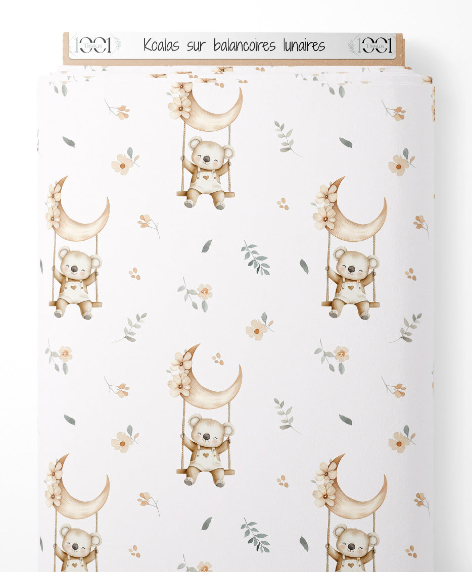 Les koalas sont assis sur des balançoires attachées à des croissants de lune dorés. Des fleurs et des feuilles dans des tons doux de beige et de vert sont éparpillées sur le fond.Les tissus
