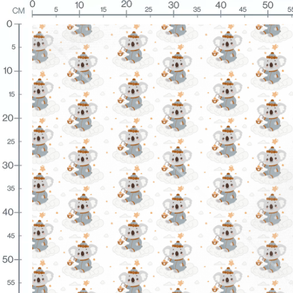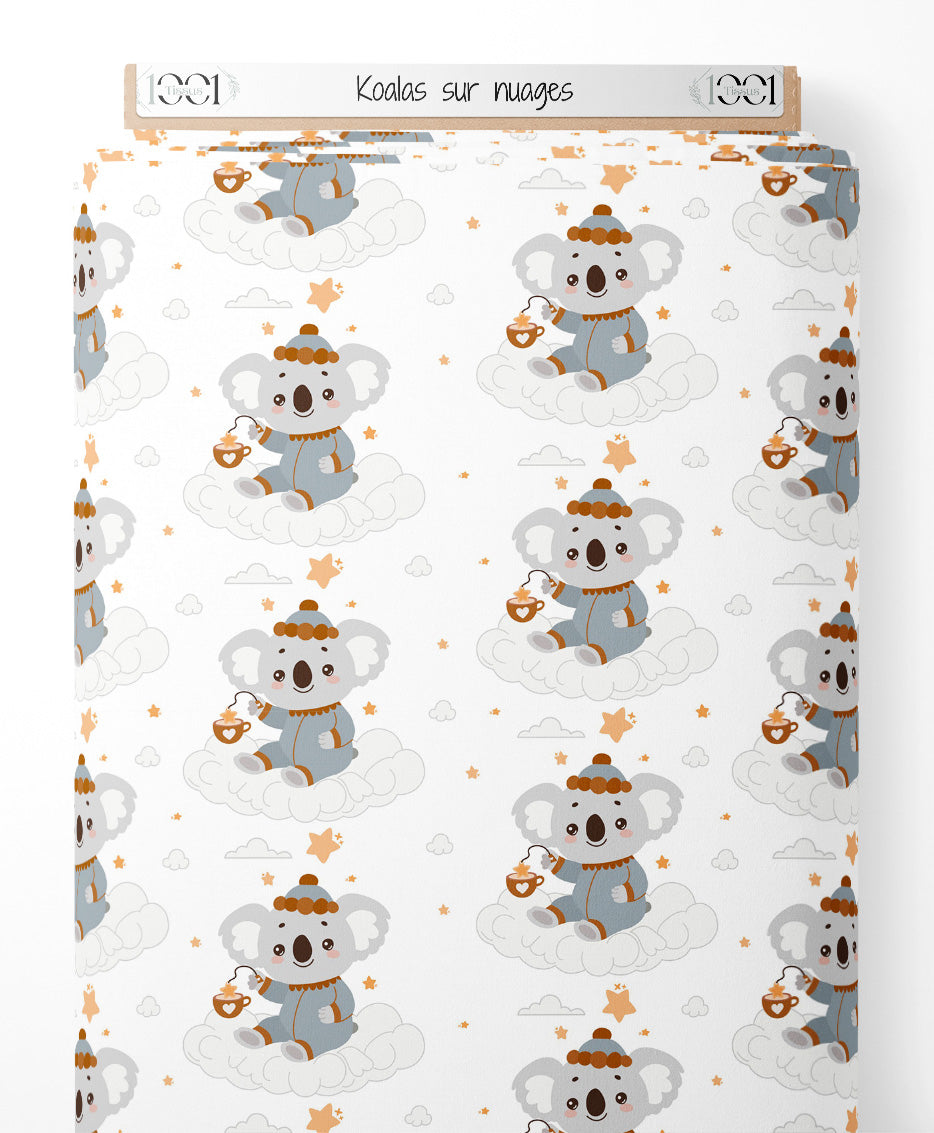 Les koalas portent des bonnets et tiennent des tasses. De petites étoiles et nuages complètent le motif.Les tissus