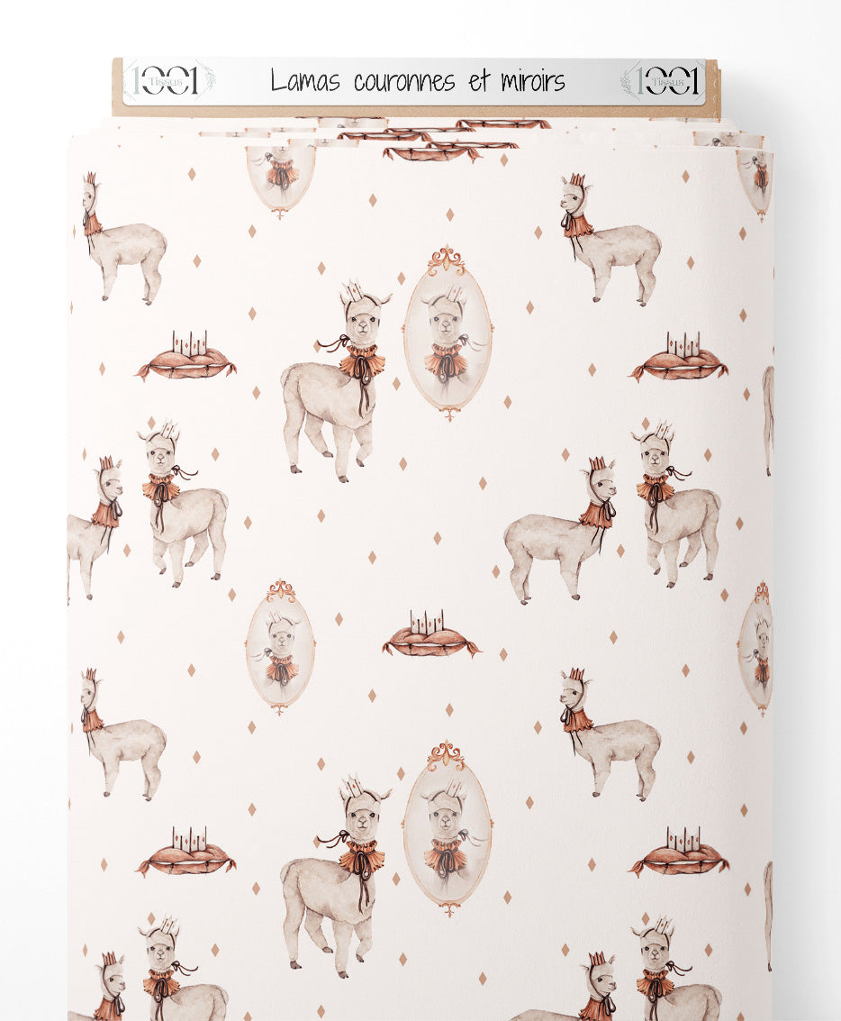 Les lamas portent des couronnes et des nœuds autour du cou. Les miroirs ovales encadrent certains lamas, ajoutant une touche élégante. Des motifs géométriques en losange complètent le design sur le fond beige.Les tissus